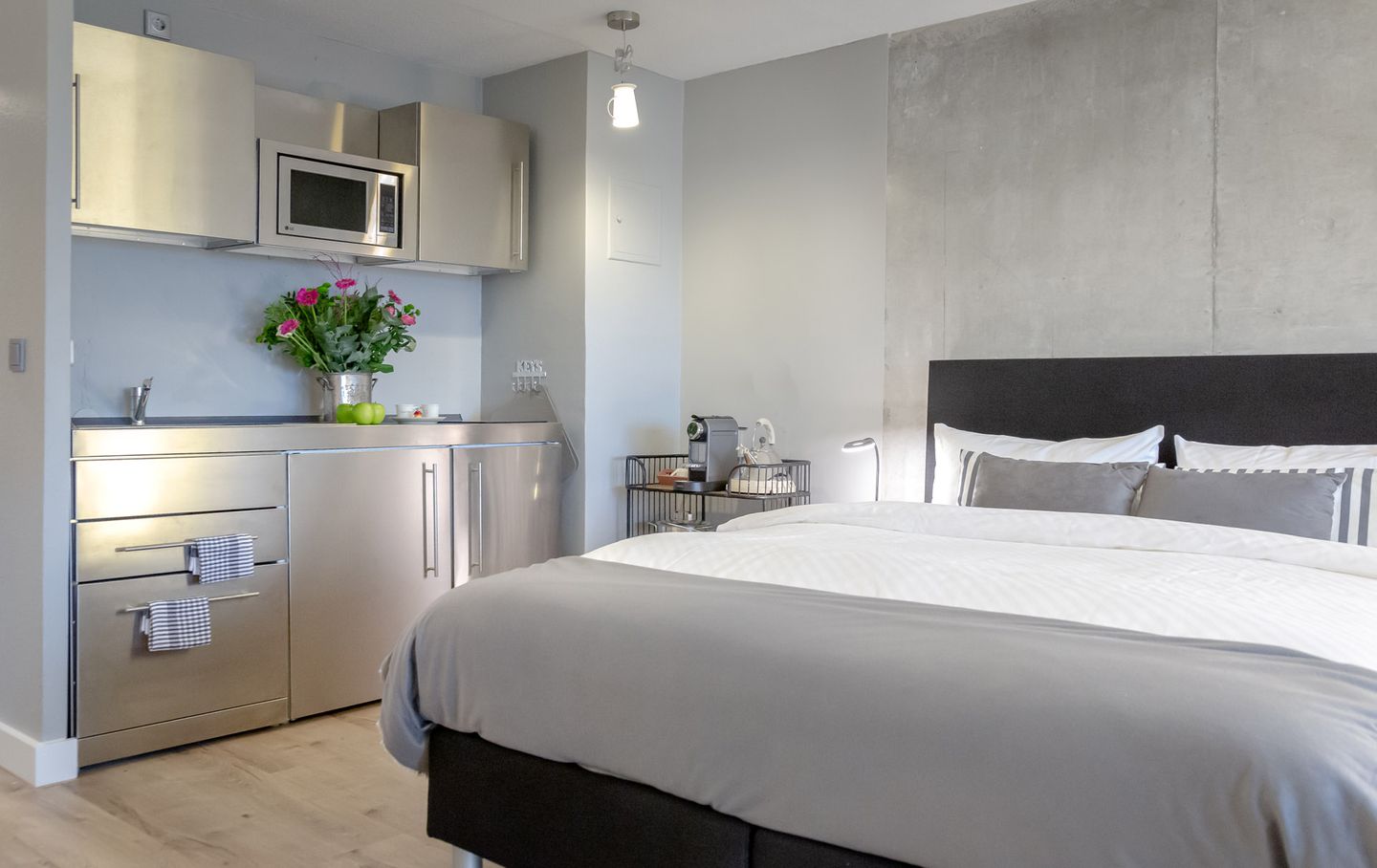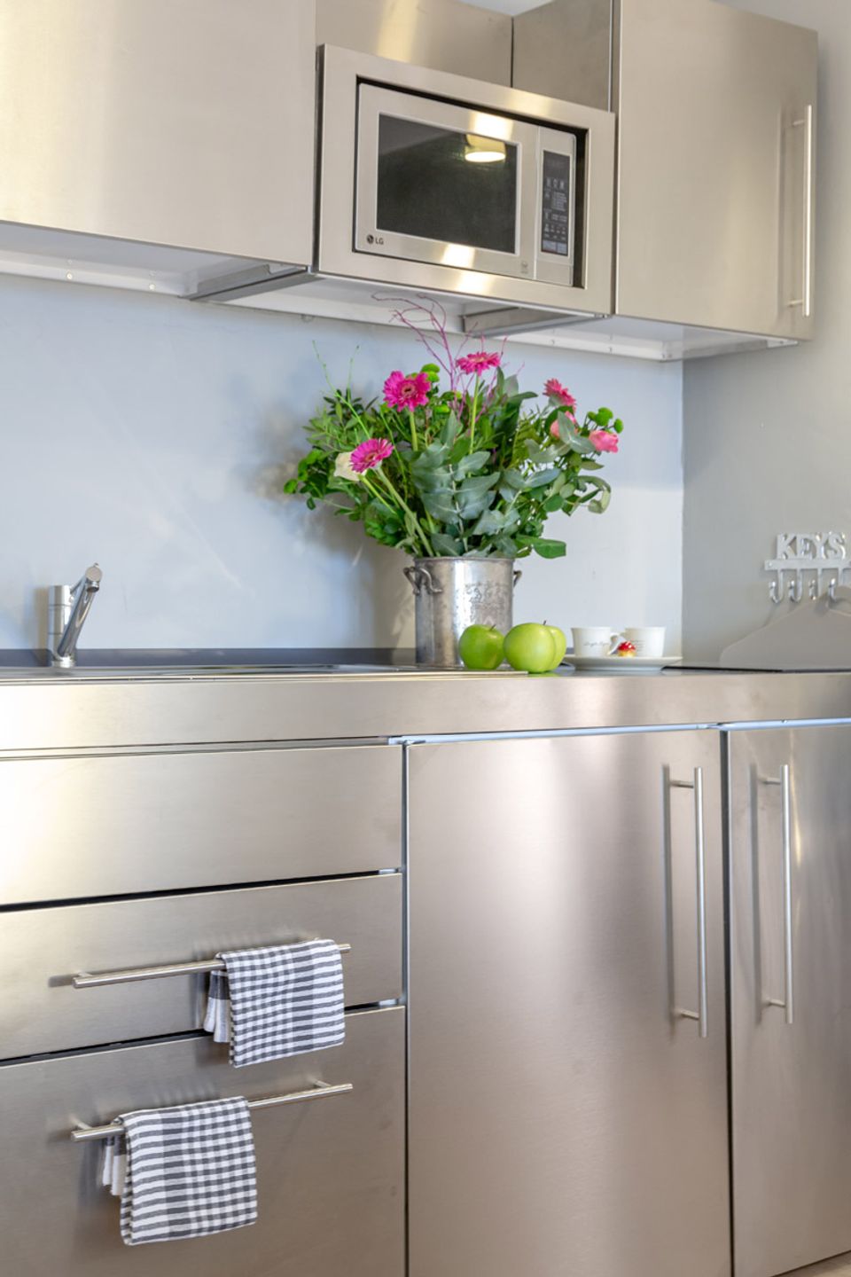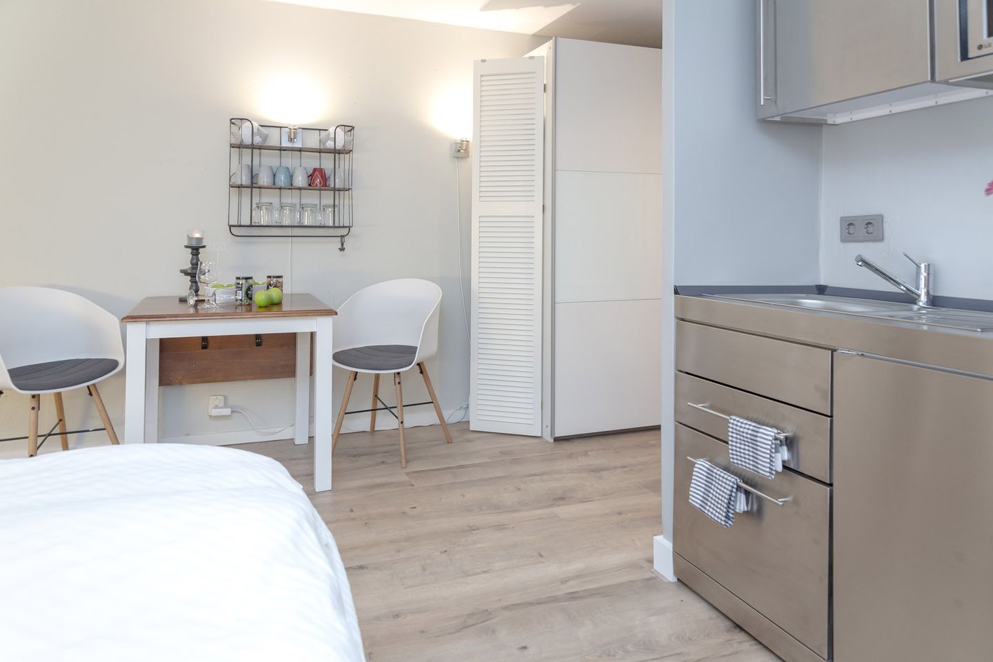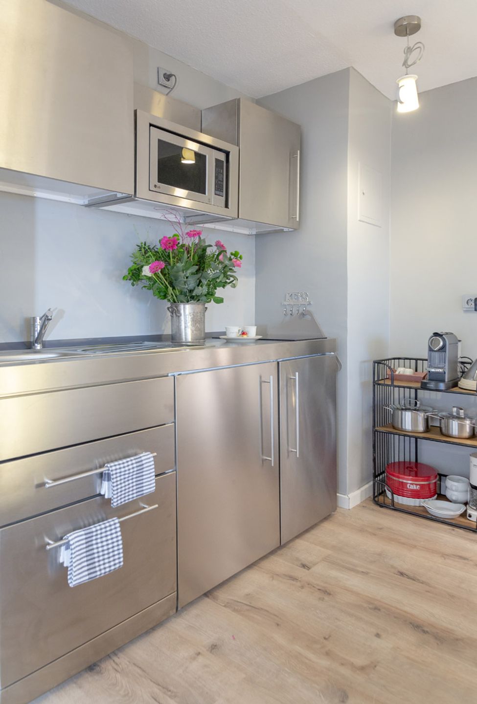 Voll ausgestattet Küche (Mikrowelle, Geschirrspüler, 2 Platten-Cerankochfeld und Nespresso Maschine), kleine Essecke, sowie der Wohn-/ Schlafbereich mit einem Boxspringbett und einem Schlafsofa (jeweils 160 x 200cm). Hier stehen Ihnen also 2 separate Schlafmöglichkeiten zur Verfügung. Diese Wohnung hat einen Balkon in Ostausrichtung mit Morgensonne im Sommer. Die Wohnung erreichen Sie bequem mit einem Fahrstuhl. Im Haus gibt es Abstellmöglichkeiten für Ihre Fahrräder.