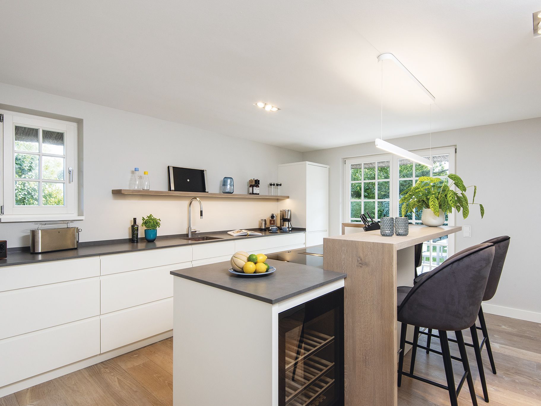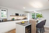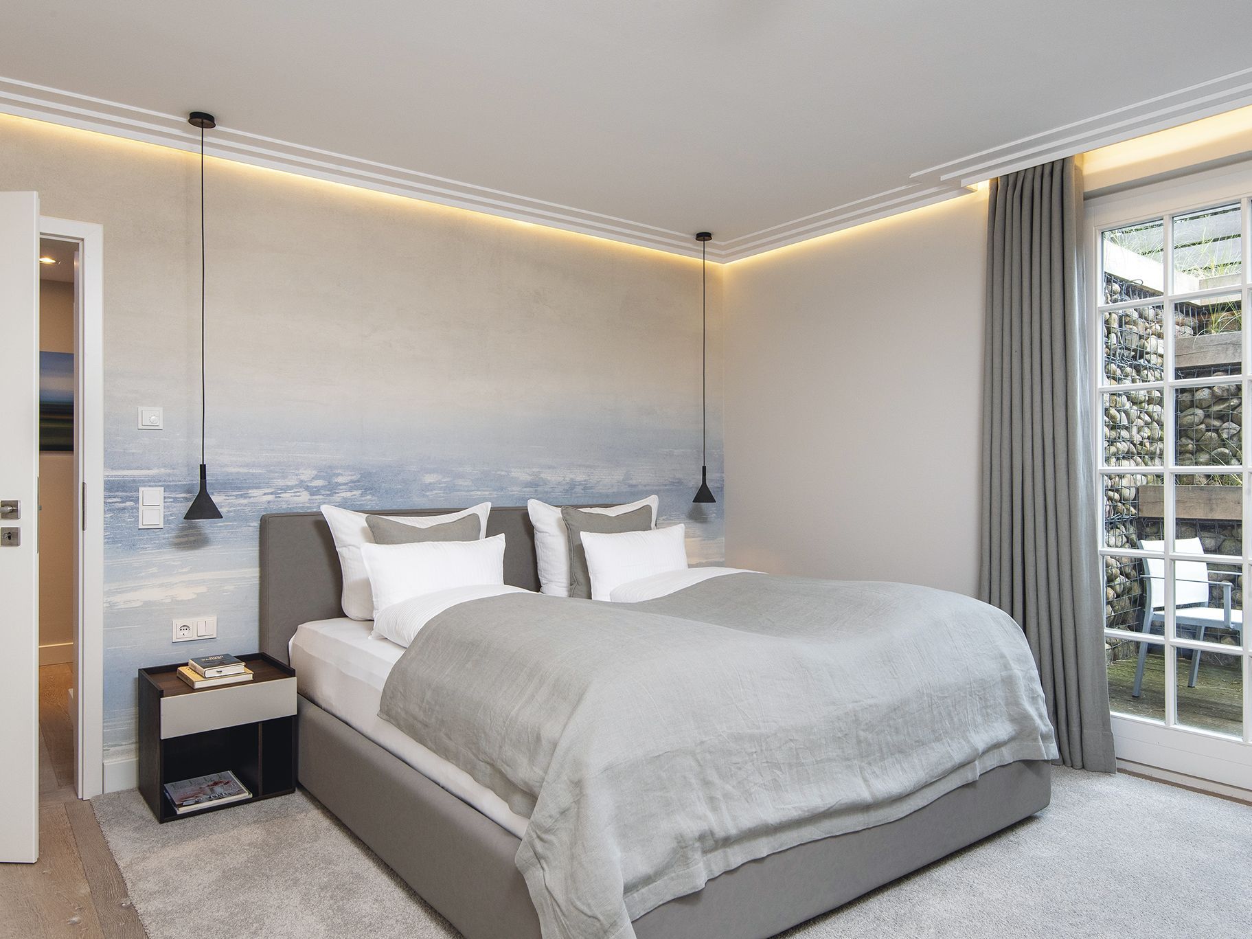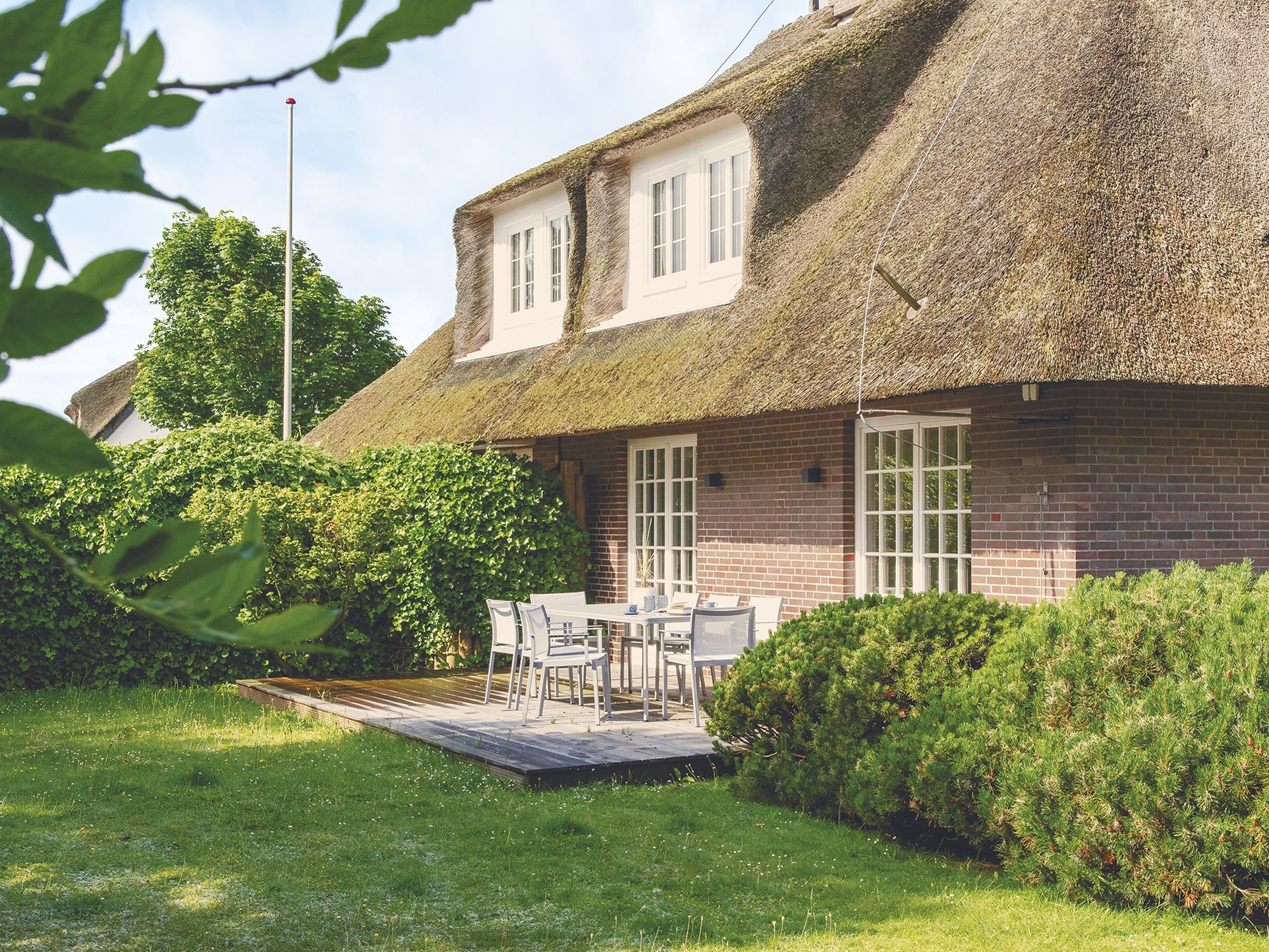 Frisch und luftig ist die Atmosphäre in diesem schönen Hausteil im Süden Kampens. Modernes Ambiente empfängt Sie im Flur. Von hier erreichen Sie den Wohn-Essbereich mit großem Esstisch, bequemem Loungesofa, Kamin und Zugang zur Südterrasse. Indirekte Beleuchtung und ein elektrischer Kamin sorgen für Gemütlichkeit, wie sie das gesamte Quartier erfüllt. Gegenüber die geräumige voll ausgestattete Küche mit Kochinsel, kleinem Essplatz am Tresen und Zugang zur Frühstücksterrasse. Ebenerdig findet sich noch ein modern eingerichtetes Doppelschlafzimmer und ein hochwertiges Bad mit ebenerdiger Dusche und Doppelwaschbecken. Im Obergeschoss erwartet Sie der Masterbedroom für Zwei, sowie ein geräumiges Bad mit Doppelwaschbecken. Über die Treppe ins Untergeschoss finden Sie zwei Doppelschlafzimmer mit Verbindungstür, eines davon mit privater Souterrain-Terrasse und ein weiteres Bad mit ebenerdiger Dusche und Doppelwaschbecken. Das Highlight dieser Etage ist der großzügige Wellnessbereich mit geräumiger Sauna, Erlebnisdusche und gemütlicher Relaxinsel, wo sich alle Widrigkeiten des Nordseewetters bestens aushalten lassen. Dieses schöne Hausteil erfüllt alle (Friesen-) Träume!