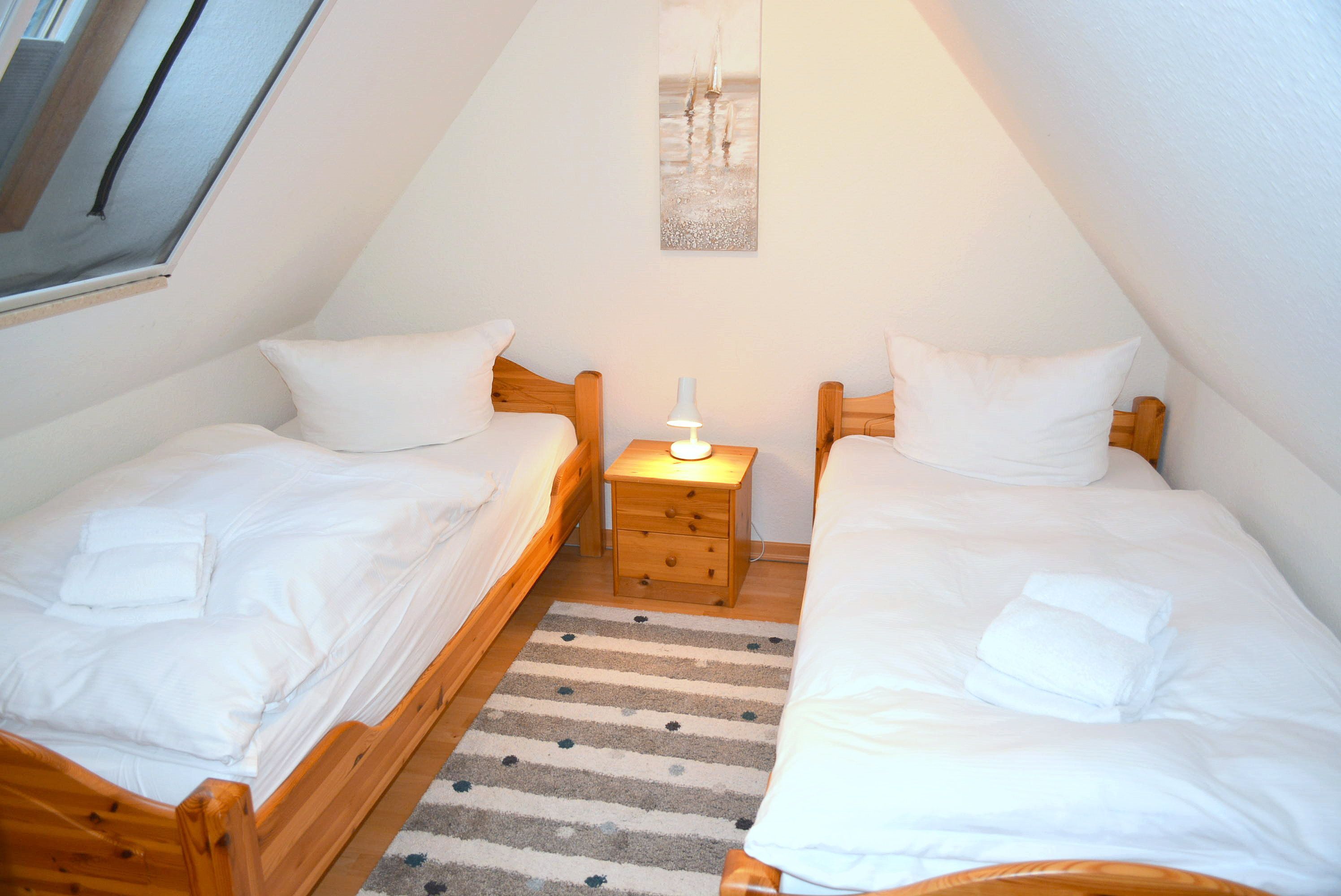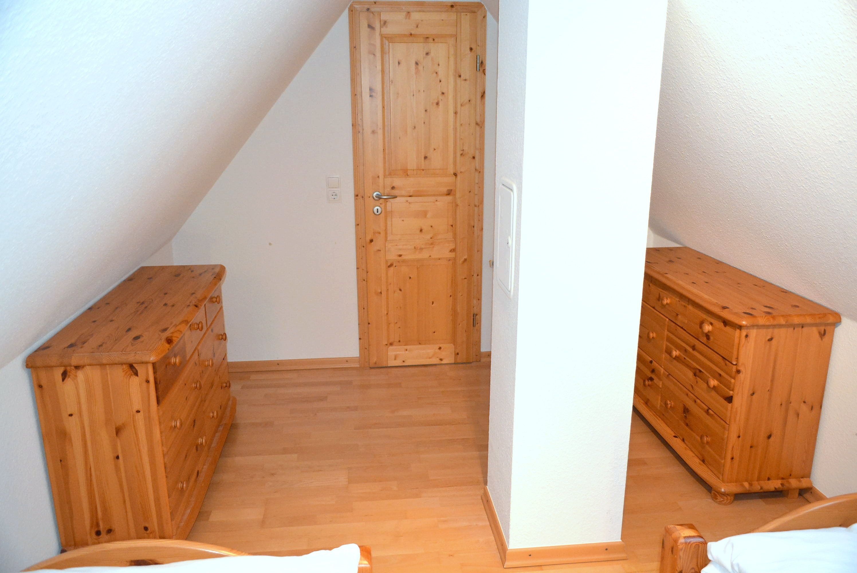 Schlafzimmer 2: 2 Einzelbetten, 2 Kommoden, Fliegengitter vor dem Fenster, Nachttisch