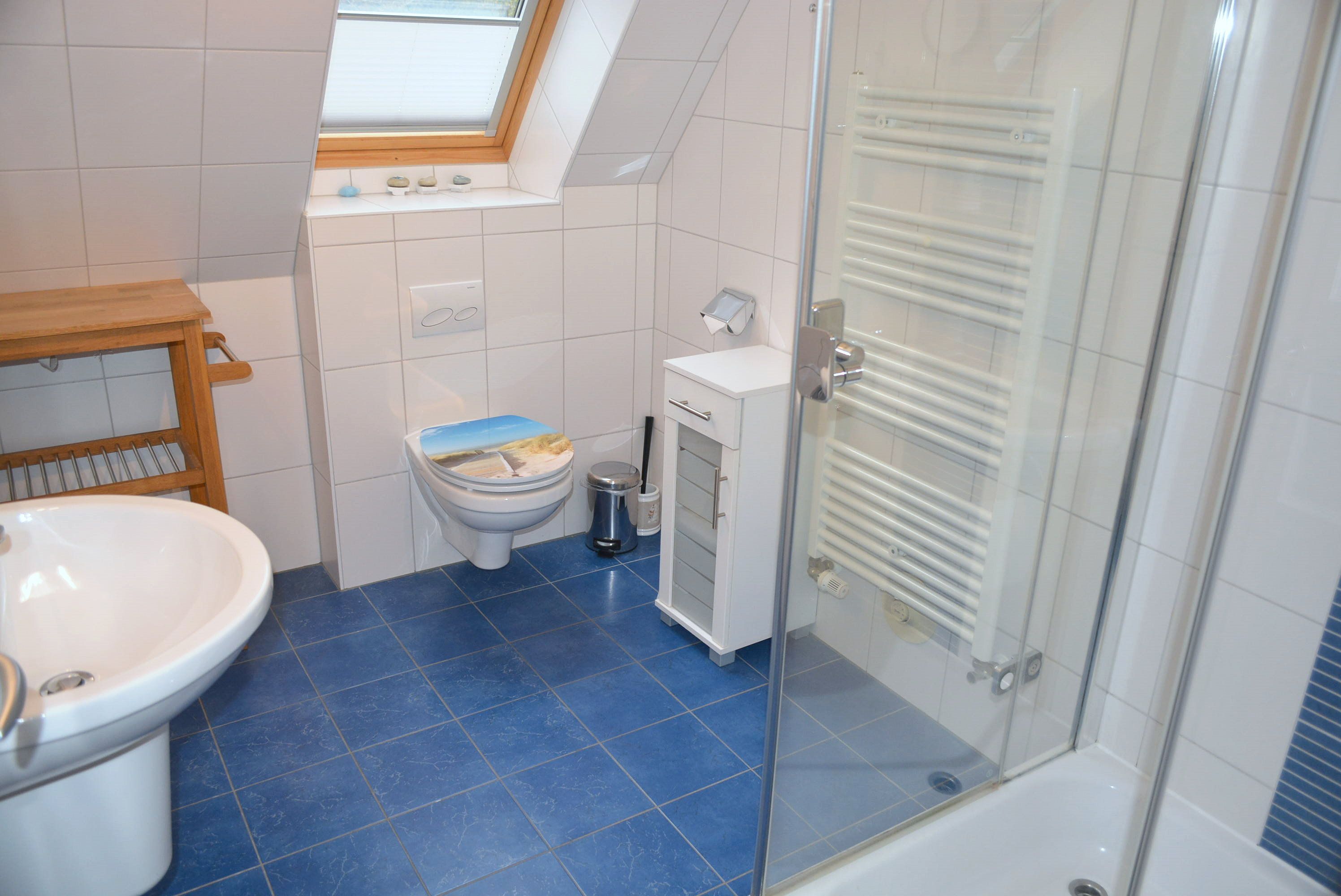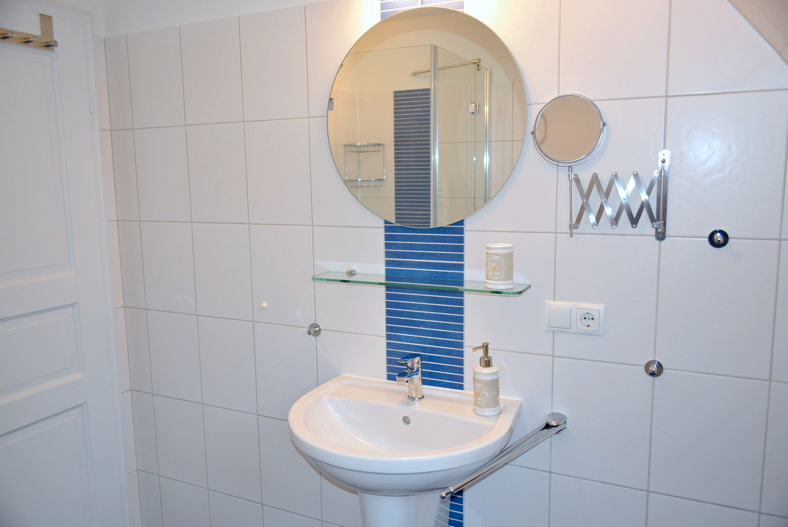 Bad 1: Dusche, Duschkabine, Fußbodenheizung, Handtuchheizkörper, kleiner Schrank, Kosmetikspiegel, Rollregal, Spiegel, Waschbecken, WC