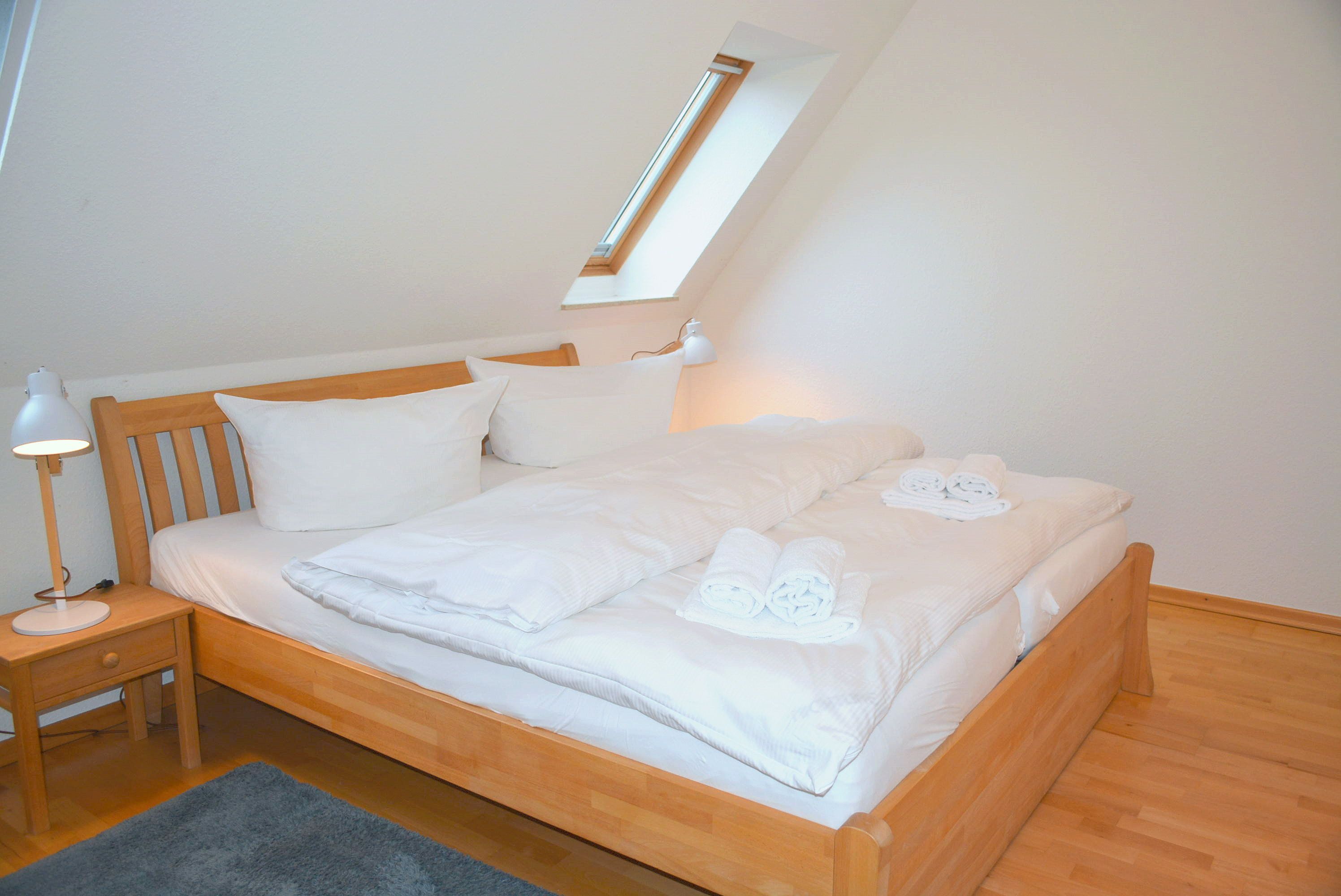 Schlafzimmer 1: 2 Nachttische, Doppelbett 2,00 x 1,80 m, Fliegengitter vor einem Fenster