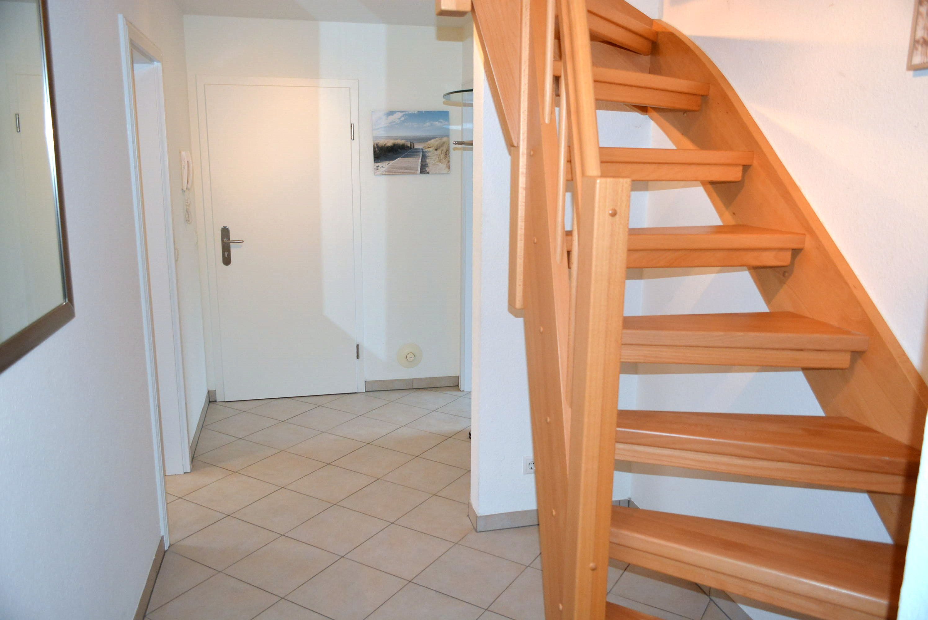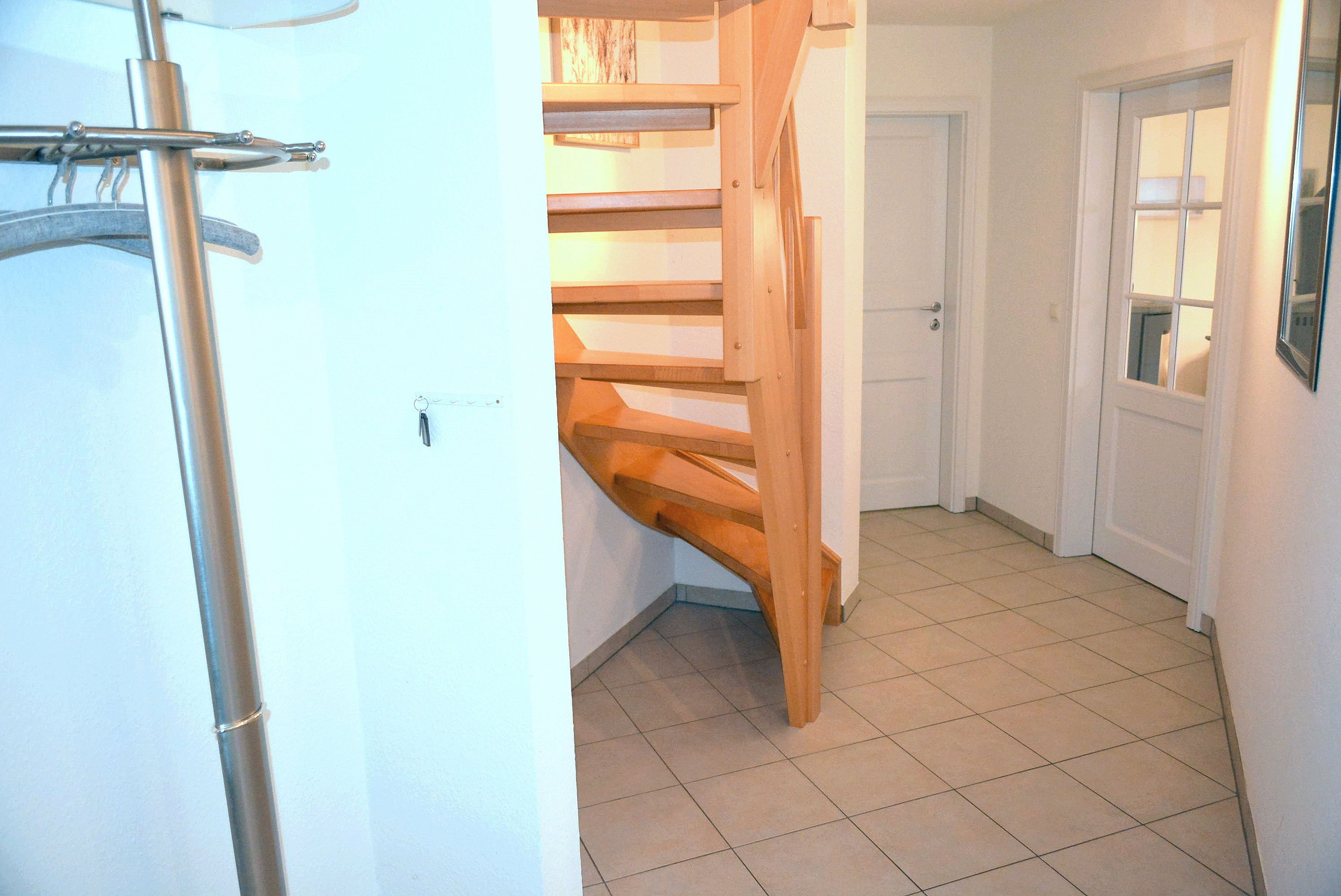 Flur: Fußbodenheizung, Garderobe, Spiegel, Treppe nach oben