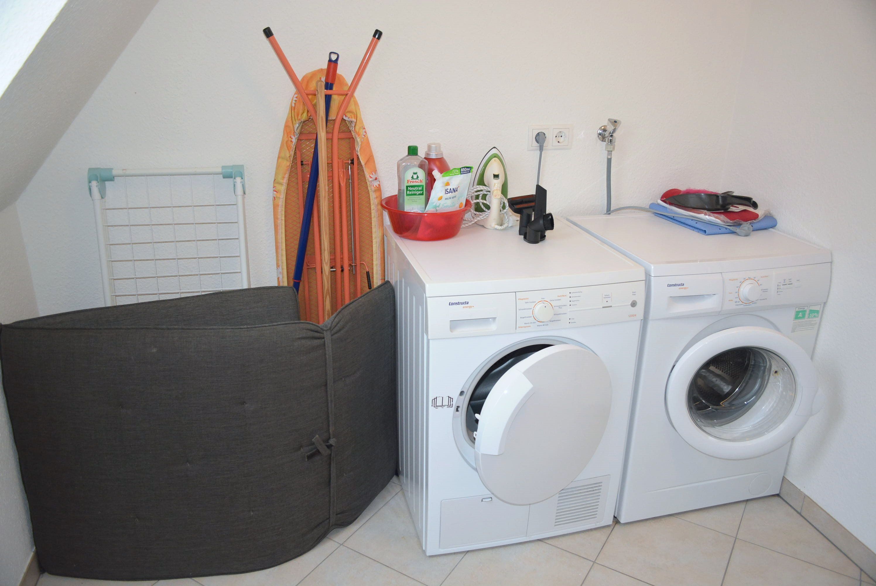 Hauswirtschaftsraum: Bügelbrett, Bügeleisen, Kinderhochstuhl, Kinderreisebett, Staubsauger, Trockner, Wäschesackständer, Waschmaschine