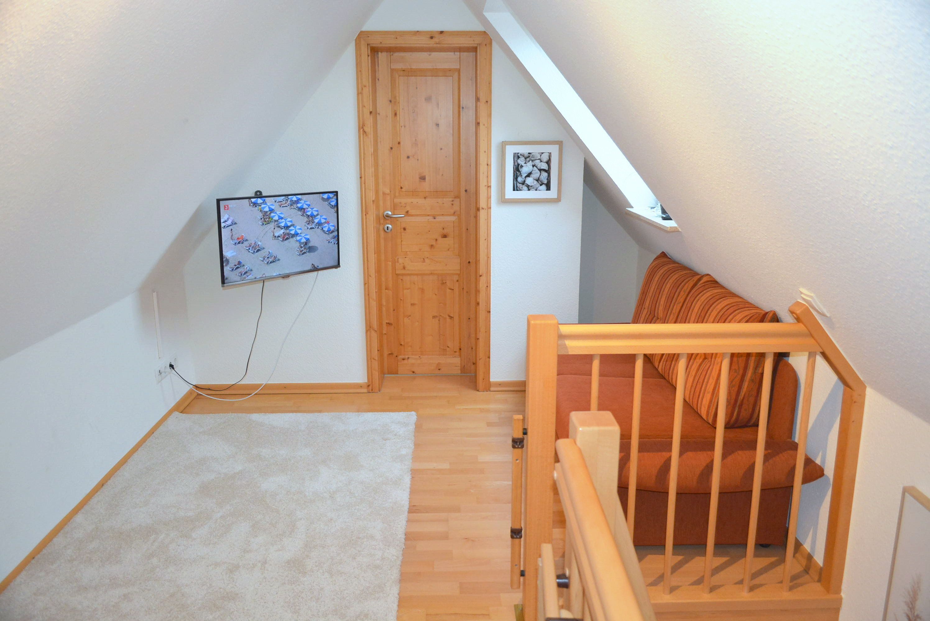 Flur 2: Couch, Kindertreppengitter, Sat-TV, Treppe nach unten