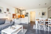 Die supermoderne Küchenecke ist ein Highlight der Wohnung: Spülmaschine, Backofen in Augenhöhe und vielseitiges Küchenzubehör bilden ein optisches Ensemble mit dem Wohnbereich. Hier steht eine Doppelschlafcouch.