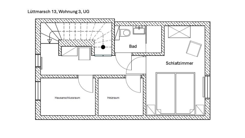 Das ehemalige Schlafzimmer im Souterrain darf auf Grund der Raumhöhe von 2,10m (Vorschrift: 2,40m) nicht mehr als Schlaf- oder Wohnraum ausgewiesen werden. Die Nutzung erfolgt auf eigene Gefahr.
