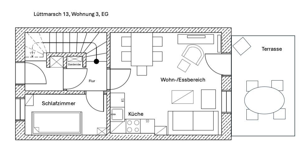 Die im EG befindliche Wohnung verfügt über eine ruhig gelegene Südterrasse mit bequemem Gartenmobiliar.