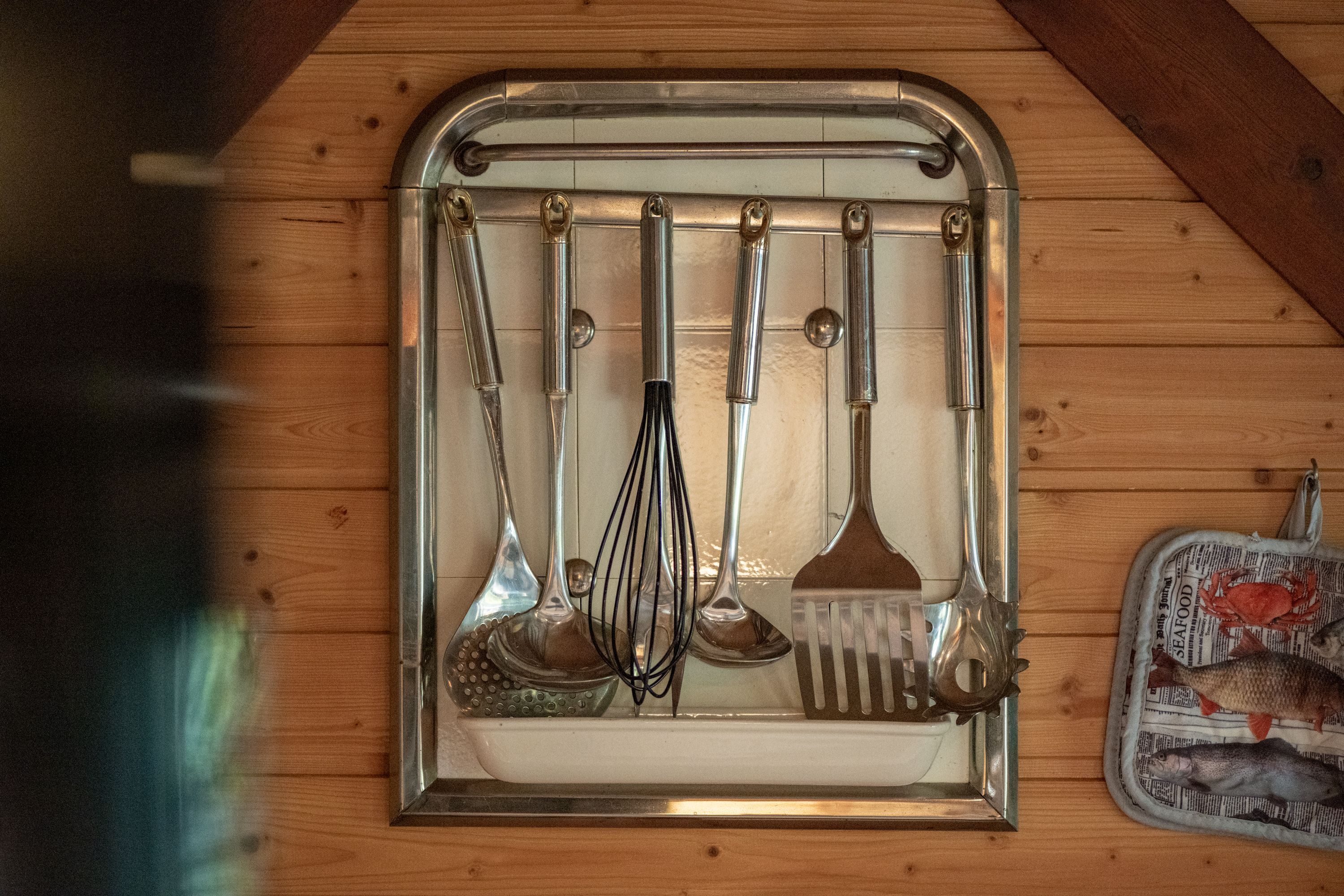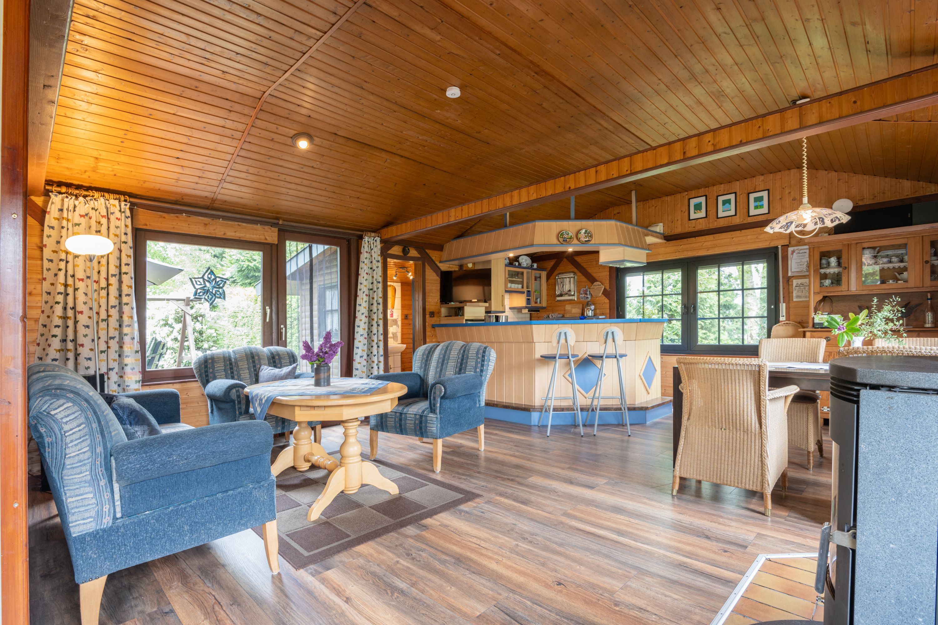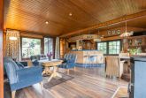 Das Blockhaus verfügt über zwei separate Schlafräume und einen großen Wohngereich mit einer offenen Küche, die sich im halbkreis und durch eine Theke abgrenzt.