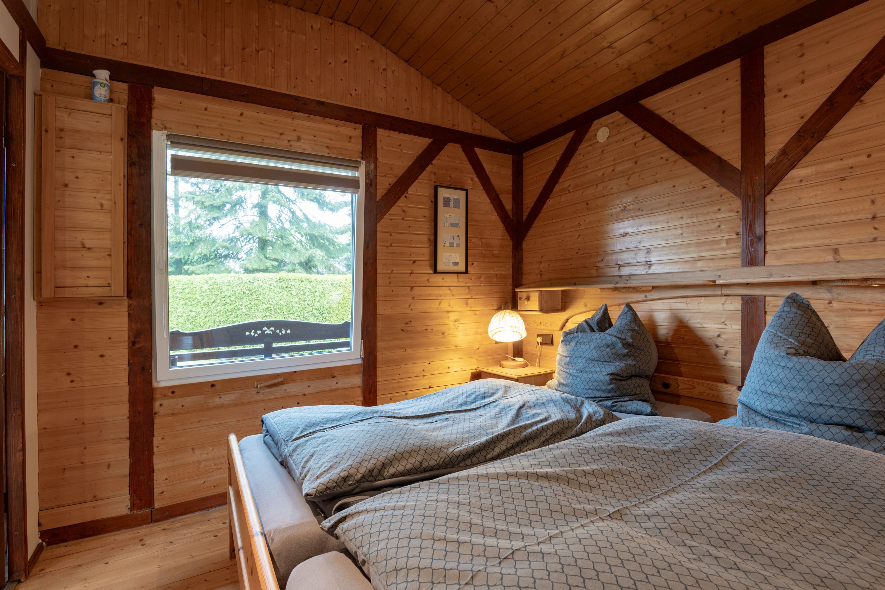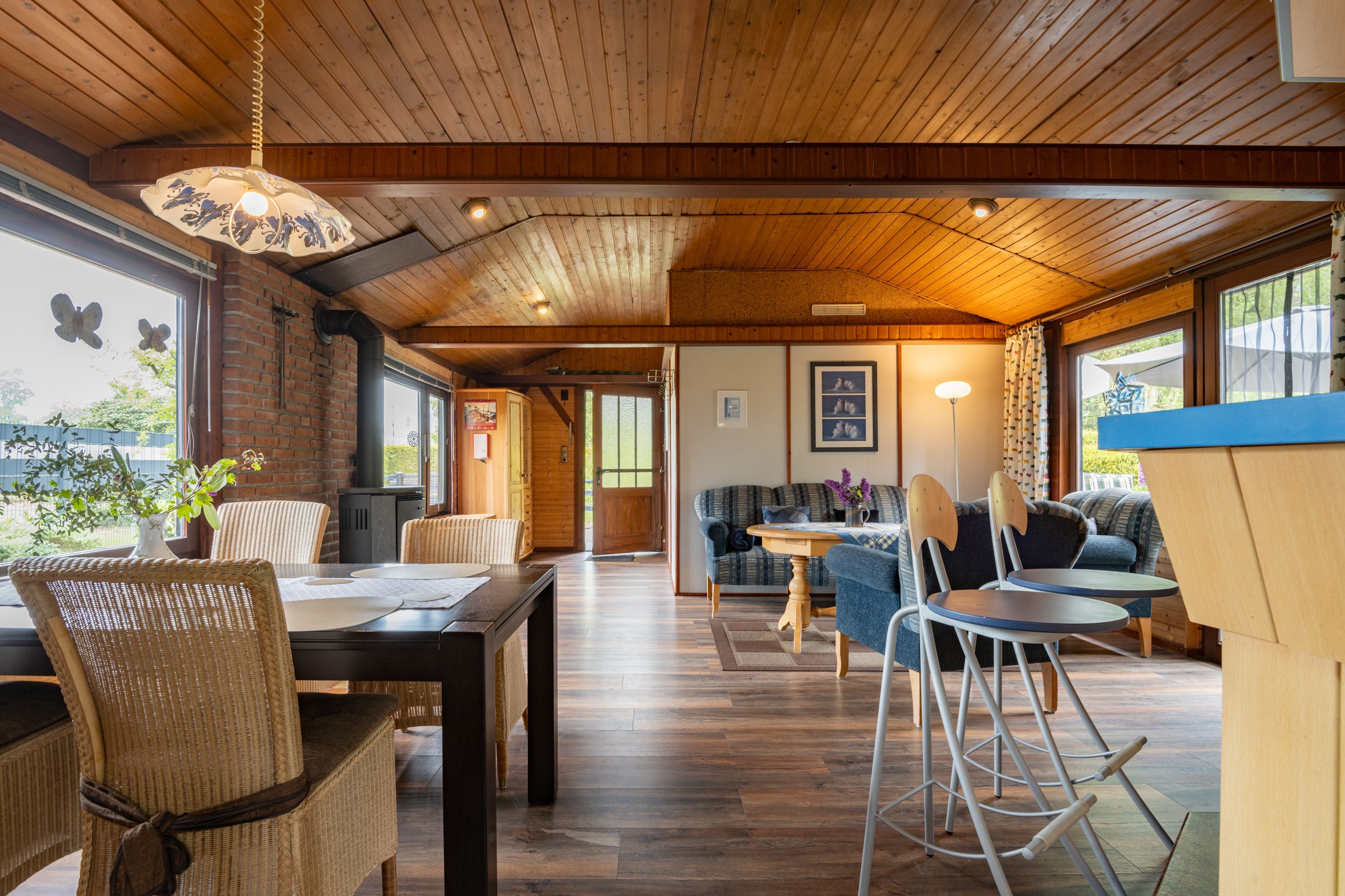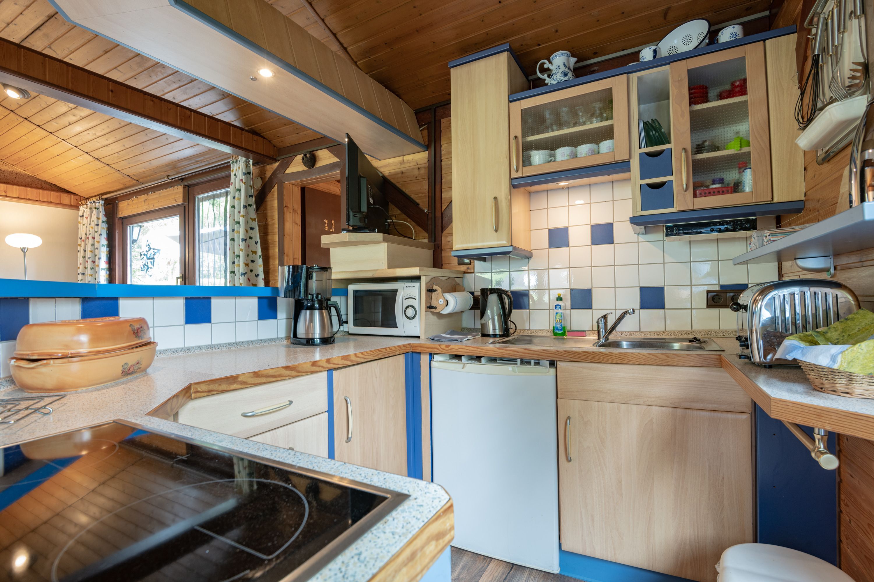 Das Blockhaus verfügt über zwei sep. Schlafräume und einen großen Wohngereich mit einer offenen Küche, die sich im halbkreis und durch eine Theke abgrenzt. Der Wohnraum ist lichtdurchflutet und hat einen kleinen Kaminofen für die kühleren Abende. Eine gemütliche Wohngarnitur (Ostfriesensofa mit zwei einzelne Sessel) und ein rechteckiger Esstisch mit vier Korbstühlen befinden sich im Wohn-/Küchenbereich. Ein Schlafraum verfügt über ein Doppelbett (1,80m x 2,00m) und im zweiten sep. Schlafraum stehen zwei Einzelbetten (0,90m x 2,00m) zur Verfügung. Neben dem Küchenbereich befindet sich ein kleines Badezimmer mit Dusche und WC.