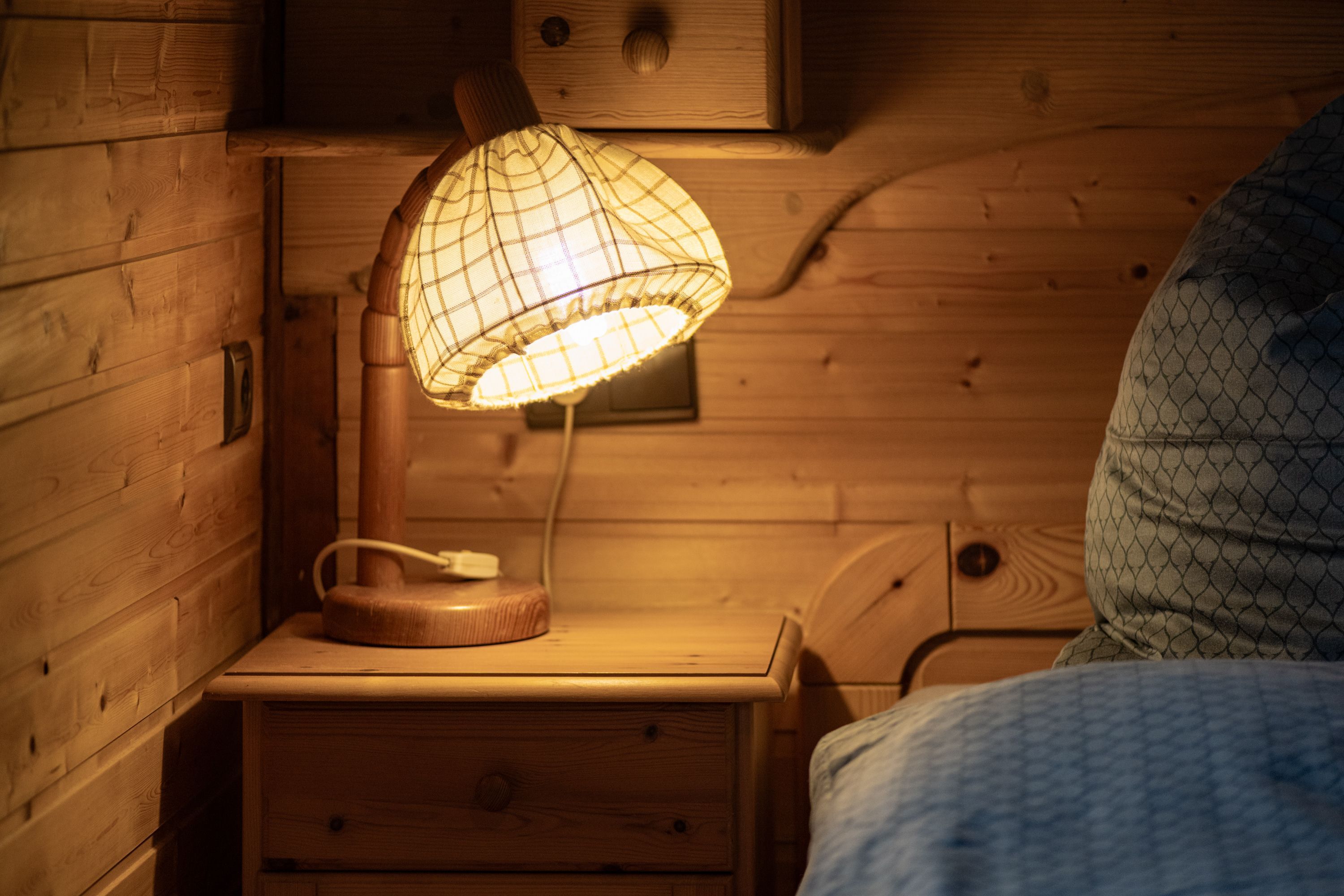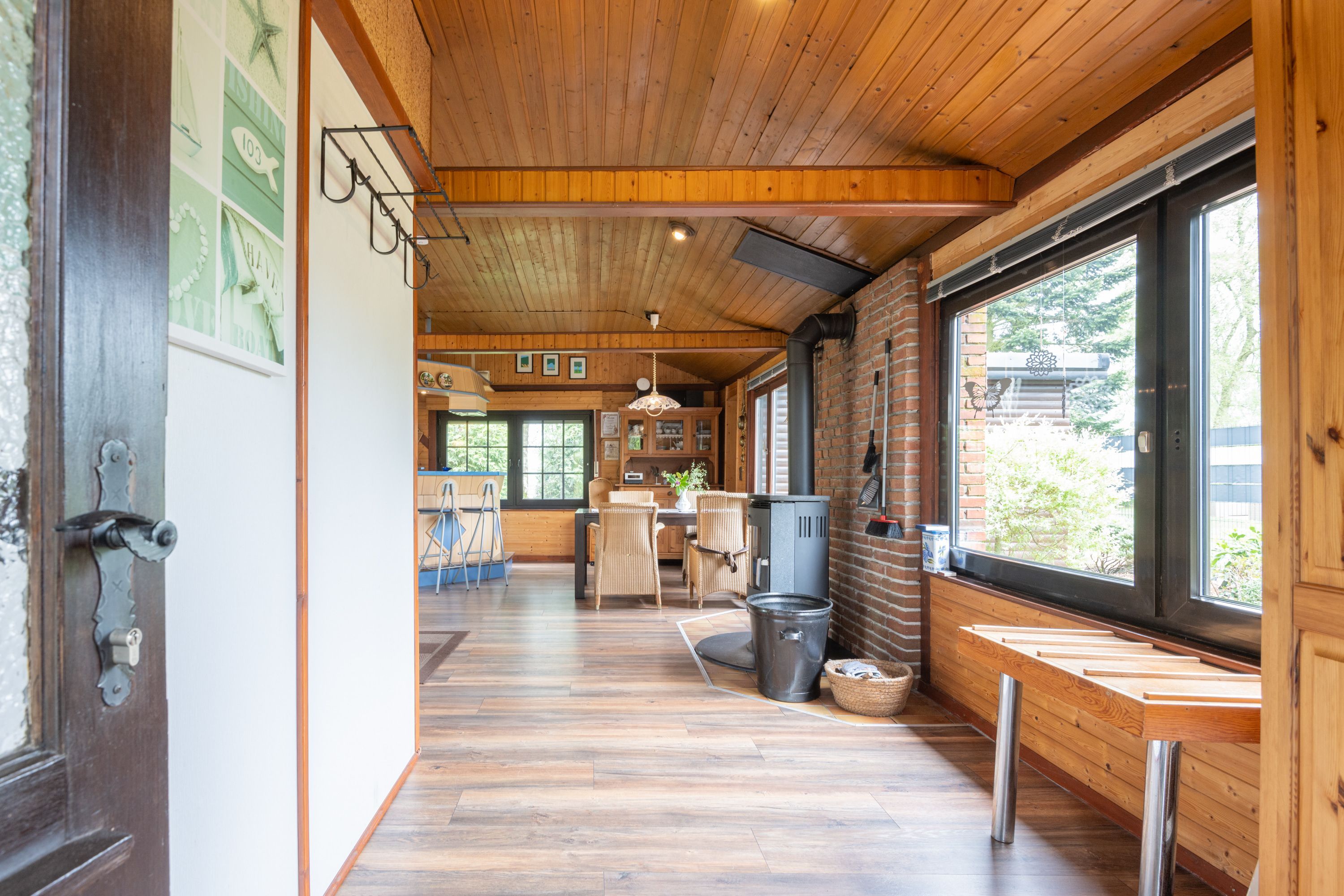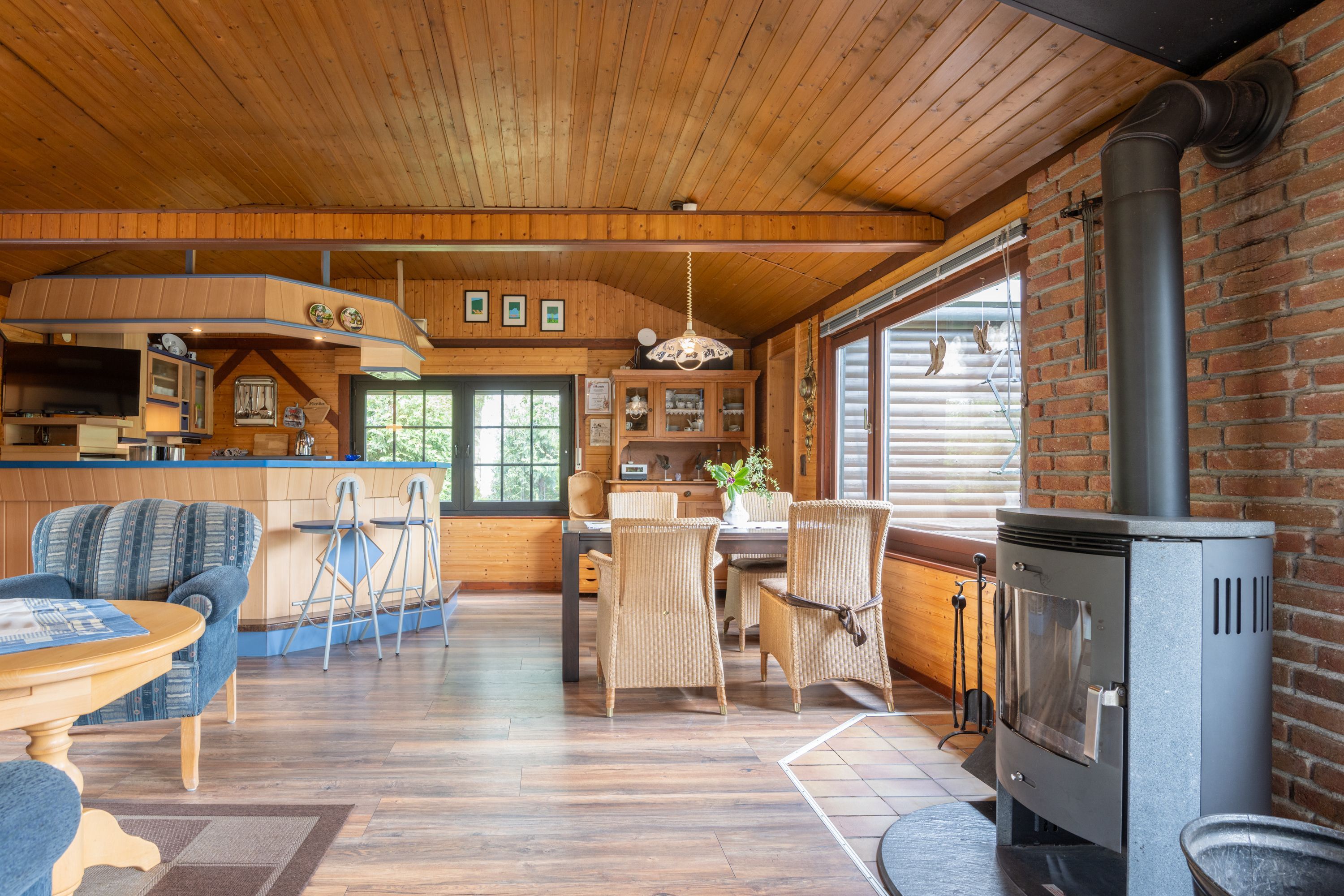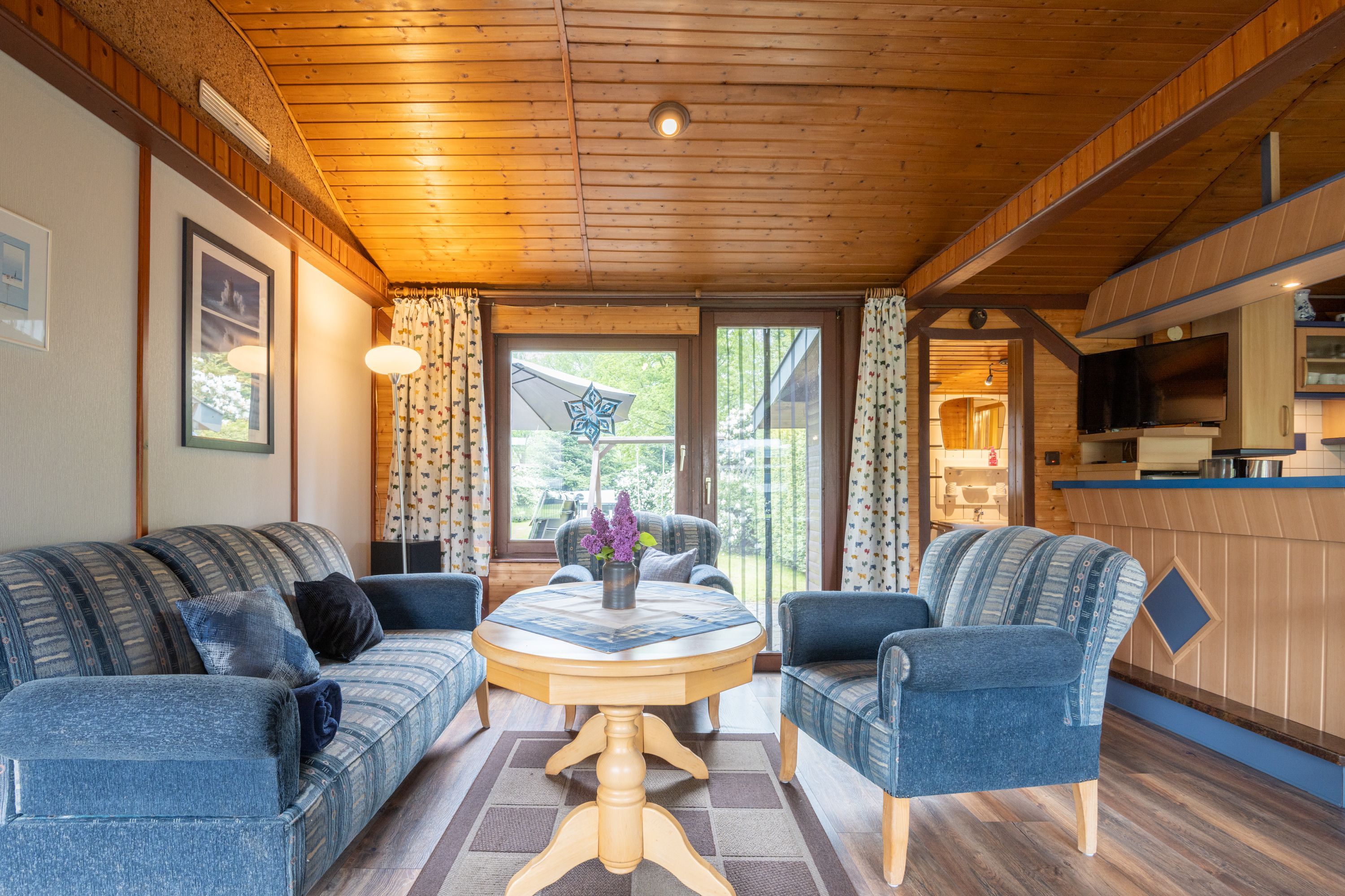 Das Blockhaus verfügt über zwei sep. Schlafräume und einen großen Wohngereich mit einer offenen Küche, die sich im halbkreis und durch eine Theke abgrenzt. Der Wohnraum ist lichtdurchflutet und hat einen kleinen Kaminofen für die kühleren Abende. Eine gemütliche Wohngarnitur (Ostfriesensofa mit zwei einzelne Sessel) und ein rechteckiger Esstisch mit vier Korbstühlen befinden sich im Wohn-/Küchenbereich. Ein Schlafraum verfügt über ein Doppelbett (1,80m x 2,00m) und im zweiten sep. Schlafraum stehen zwei Einzelbetten (0,90m x 2,00m) zur Verfügung. Neben dem Küchenbereich befindet sich ein kleines Badezimmer mit Dusche und WC.