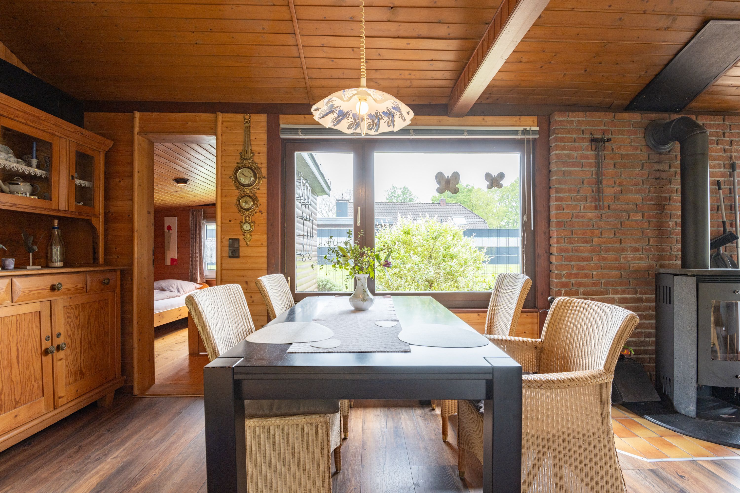 Der Wohnraum ist lichtdurchflutet und hat einen kleinen Kaminofen für die kühleren Abende. Eine gemütliche Wohngarnitur (Ostfriesensofa mit zwei einzelnen Sesseln) und ein rechteckiger Esstisch mit vier Korbstühlen befinden sich im Wohn-/Küchenbereich.