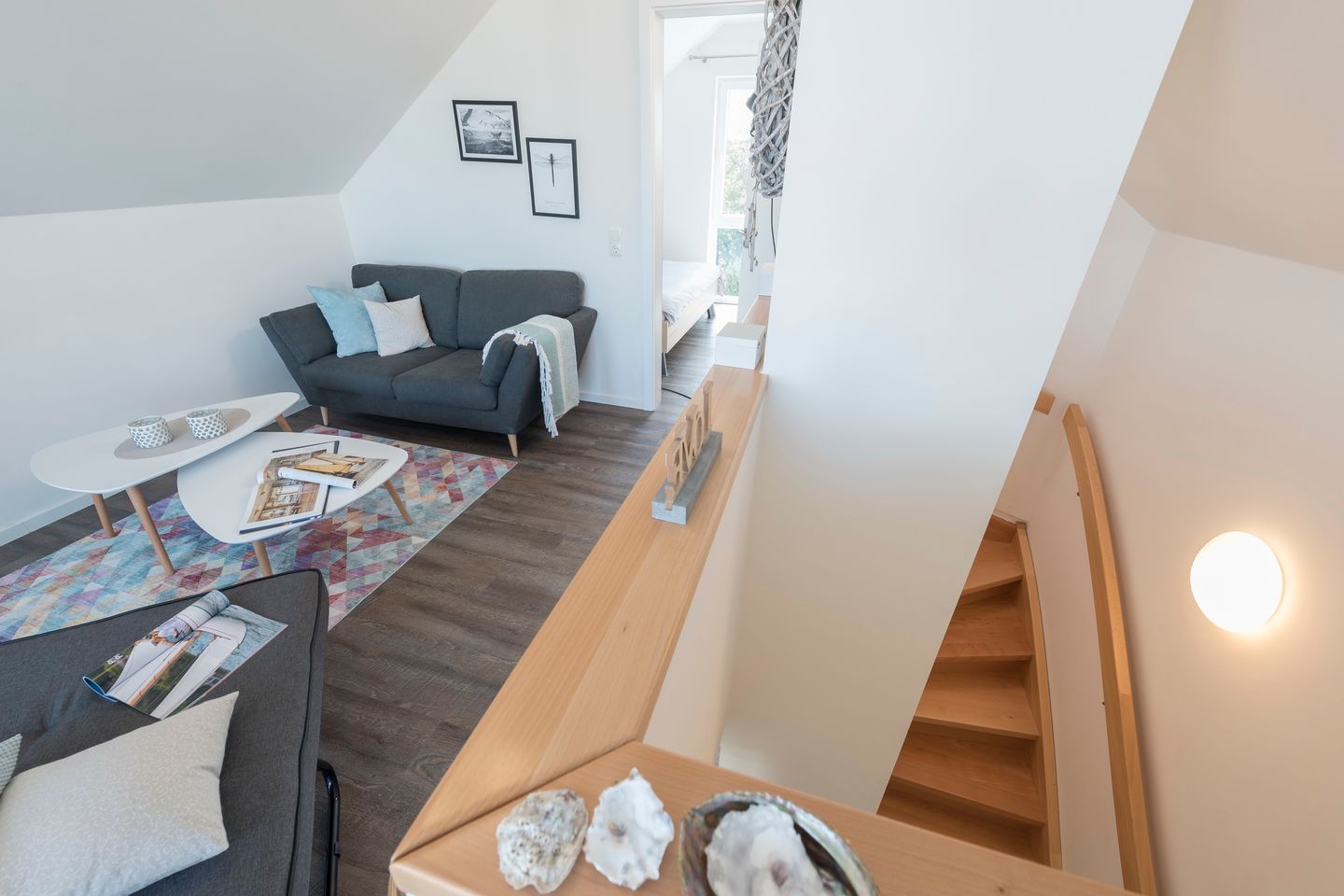 Bereits beim Frühstück könnt ihr auf der großzügigen und südlich gelegenen Terrasse die idyllische Lage am Wasser und den Blick ins Grüne genießen. Der Terrasse ist vom Wohnbereich aus begehbar. Ein überdachter Balkon zur Meerseite mit Blick auf den vorgelagerten Deich verspricht Nordseefeeling pur. Der Balkon befindet sich im Dachgeschoss und ist von einem weiteren Wohnbereich auf der Galerie aus begehbar.