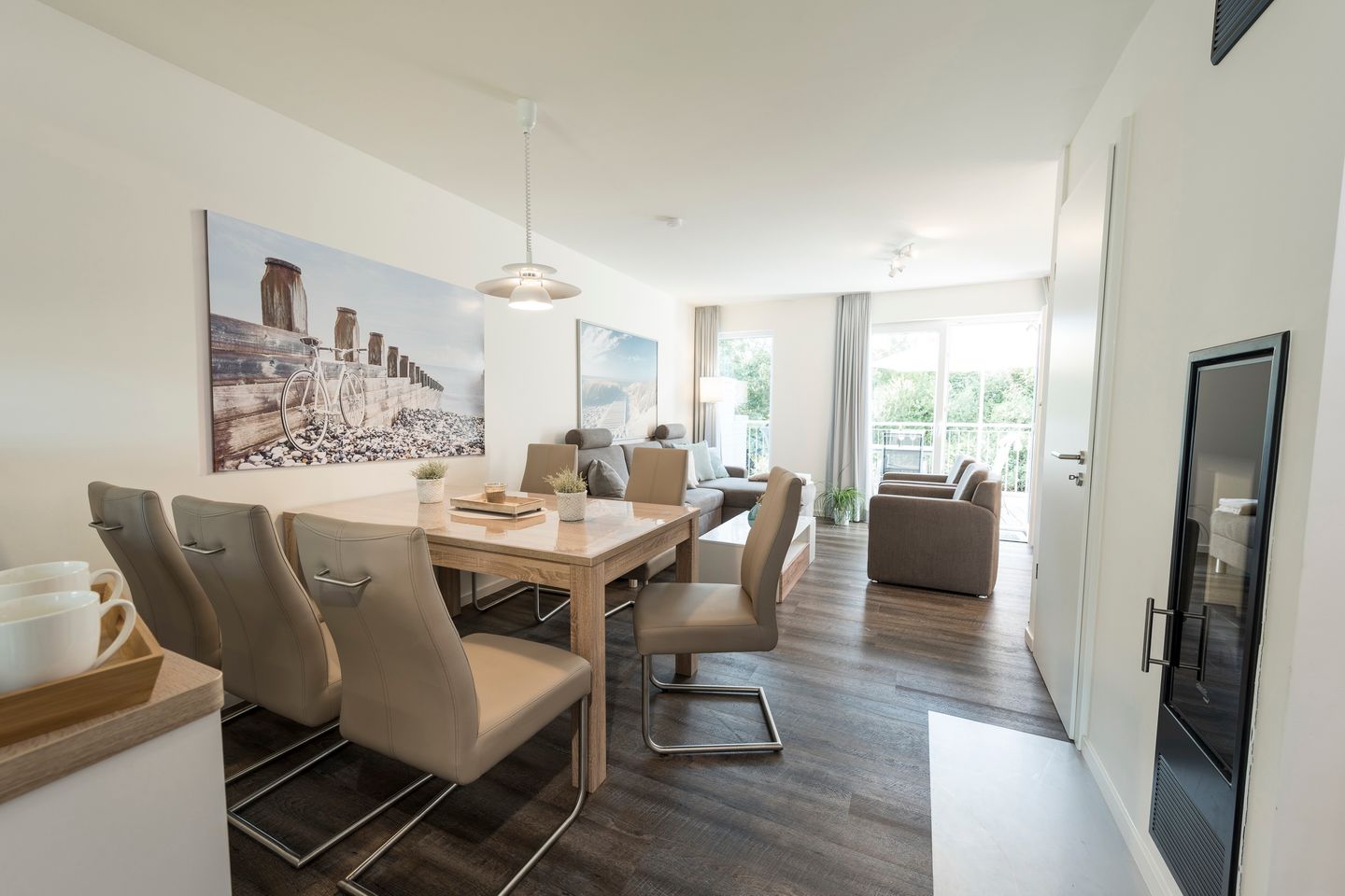Die hochwertigen und modernen Nichtraucher-Ferienhäuser verfügen über eine eigene Sauna, offene Küche und Balkone - wahlweise mit Meerblick. Hier könnt ihr über ganz Schillig bis zur Nordsee und zum Horizont sehen.
