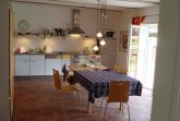 • große Küche mit Spülmaschine, Cerankochfeld, Backofen und großem Esstisch für 6 Personen
