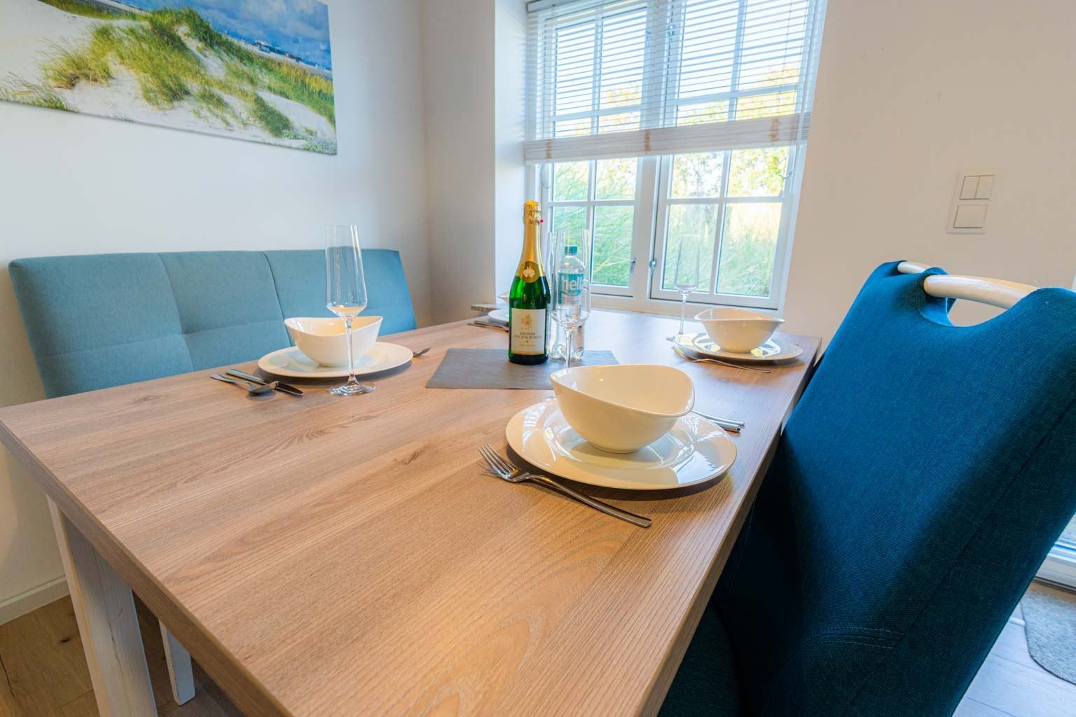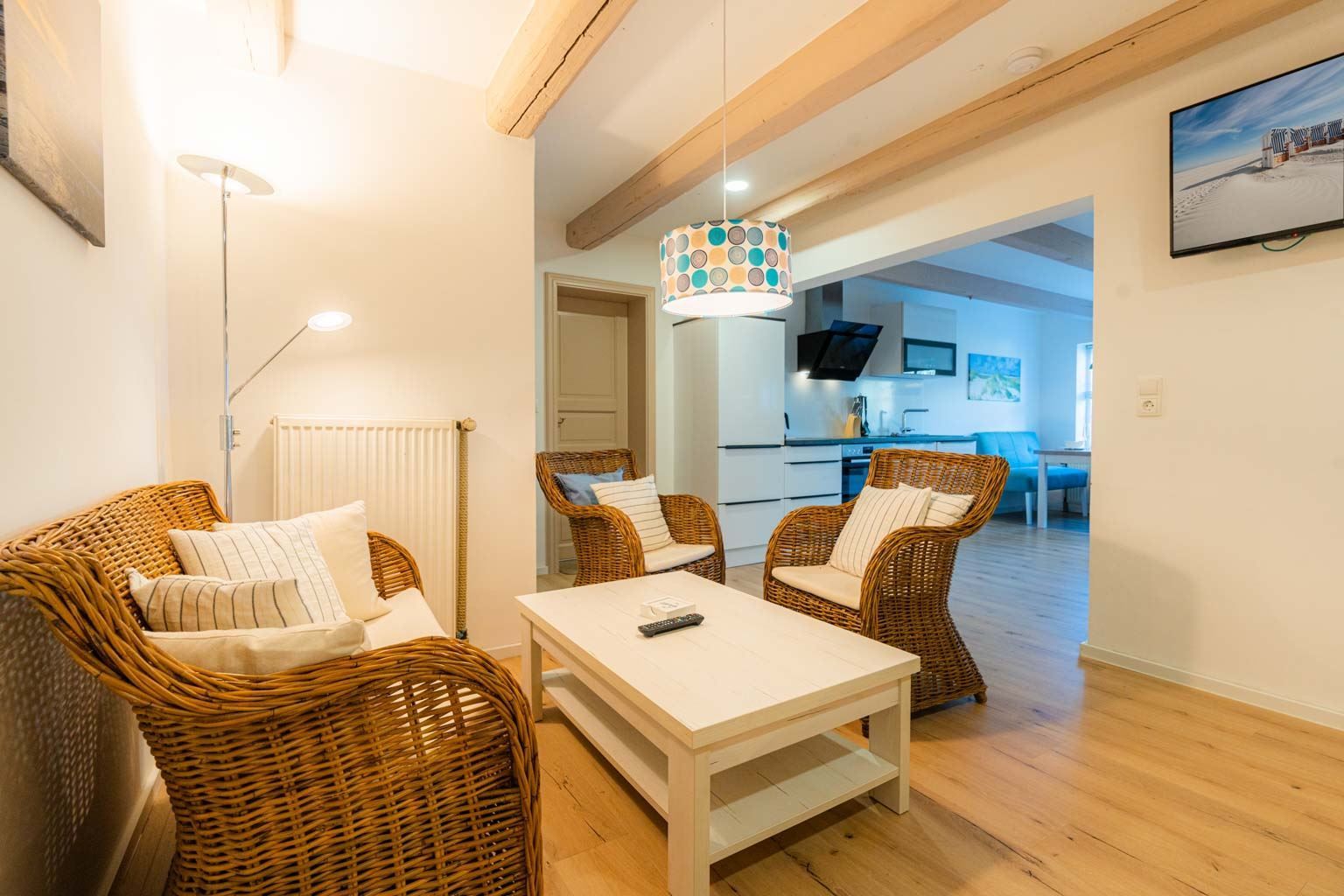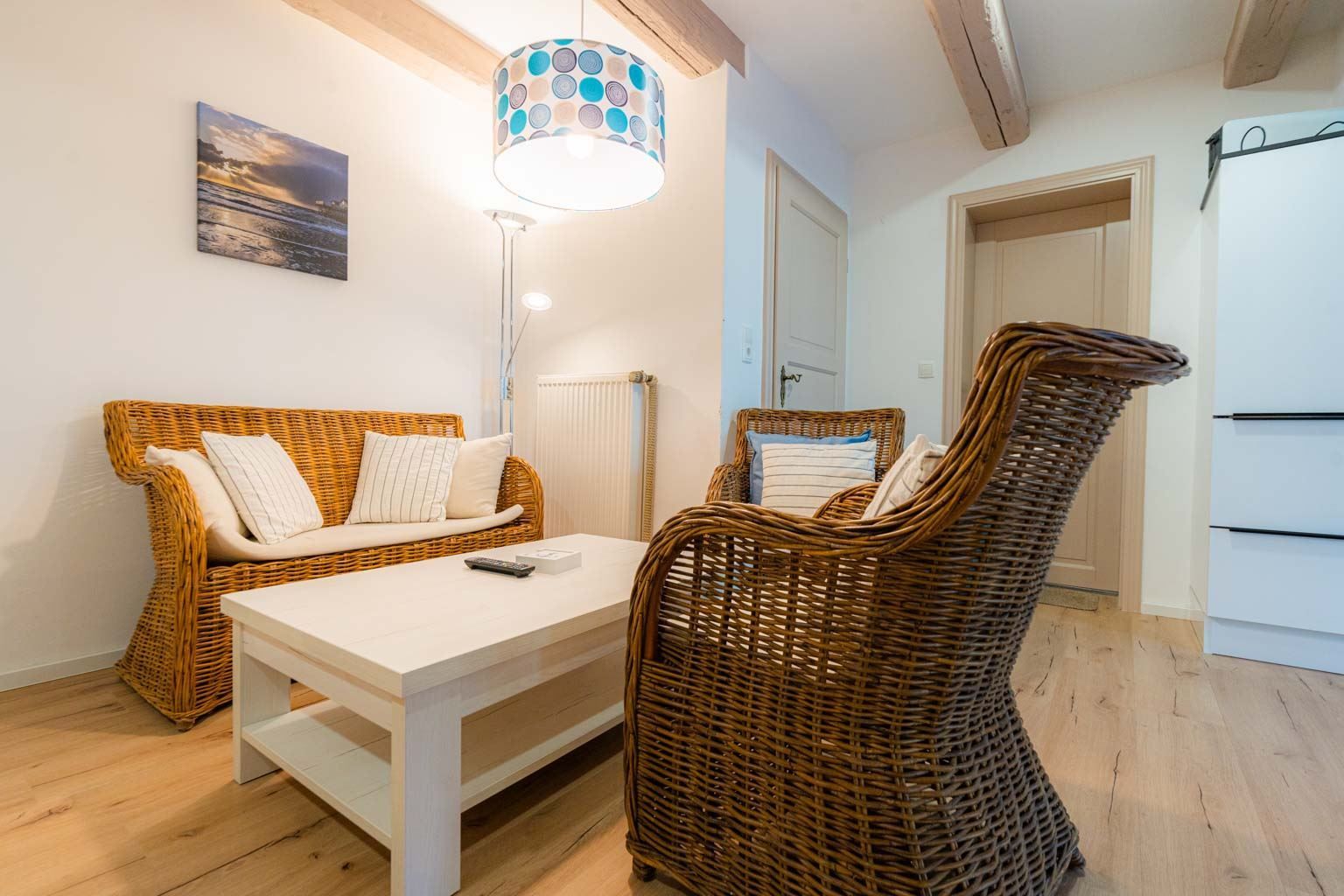 Wohn- und Schlafzimmer mit Korbsofa, 2 Korbsesseln, SMART-TV, Esstisch mit Sitzbank und 2 Stühlen, Doppelbett (160x200cm, Boxspring) und Kleiderschränken. Offene Küche mit Backofen, Geschirrspüler und Kühlschrank (Gefriermöglichkeit im Gemeinschaftsraum). Direkter Zugang zur möblierten Terrasse nach Norden mit Dünengras-Wall.