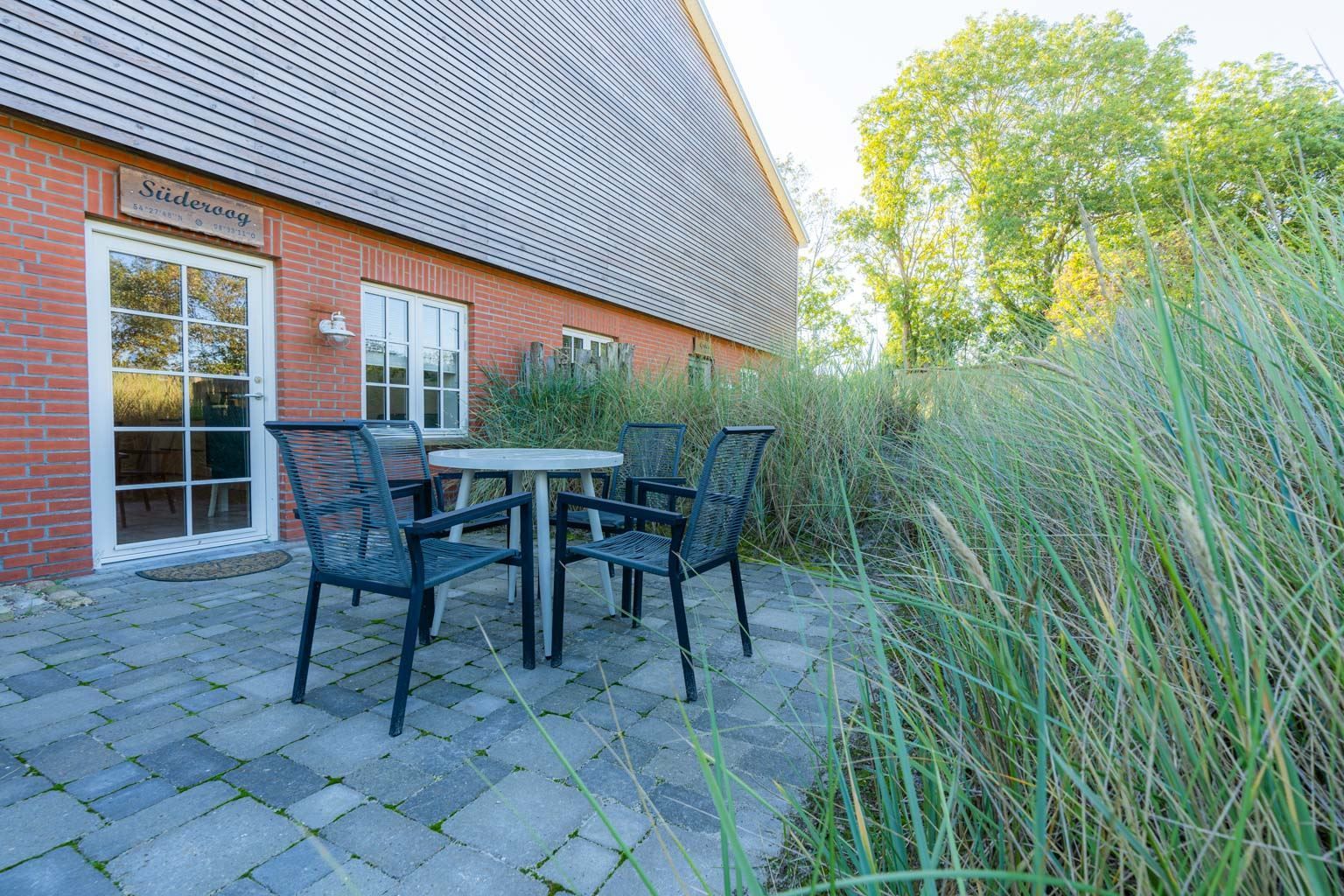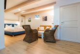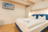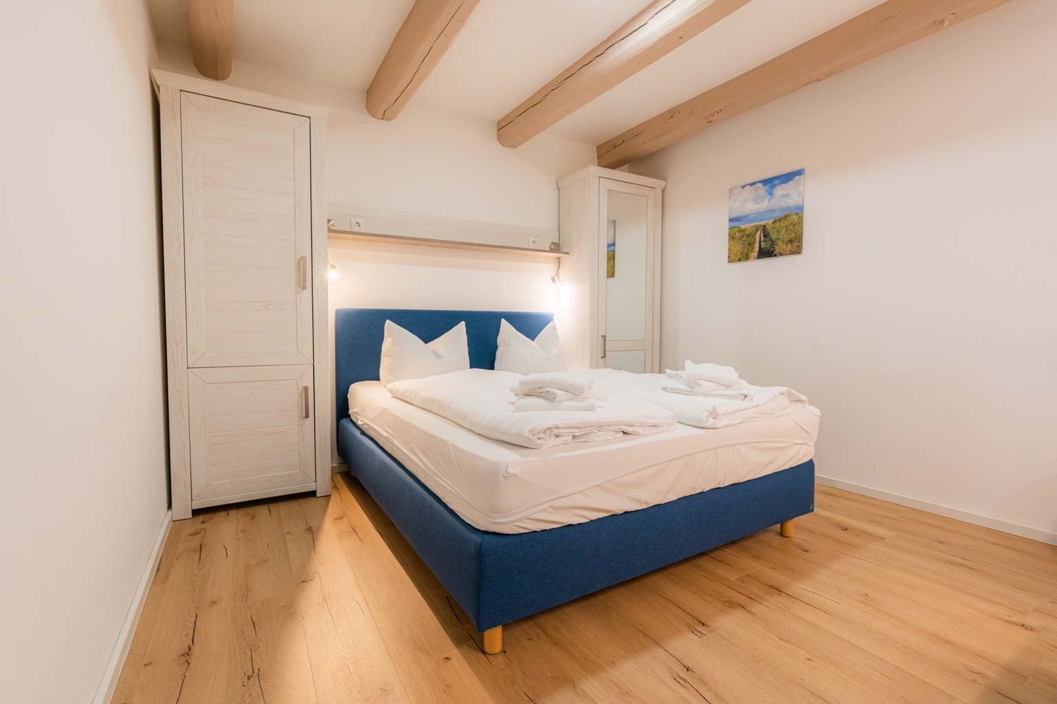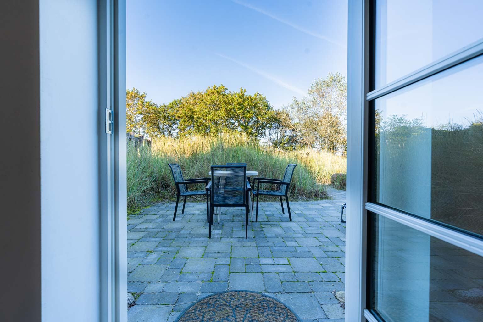 Wohn- und Schlafzimmer mit Korbsofa, 2 Korbsesseln, SMART-TV, Esstisch mit Sitzbank und 2 Stühlen, Doppelbett (160x200cm, Boxspring) und Kleiderschränken. Offene Küche mit Backofen, Geschirrspüler und Kühlschrank (Gefriermöglichkeit im Gemeinschaftsraum). Direkter Zugang zur möblierten Terrasse nach Norden mit Dünengras-Wall.