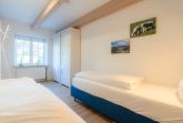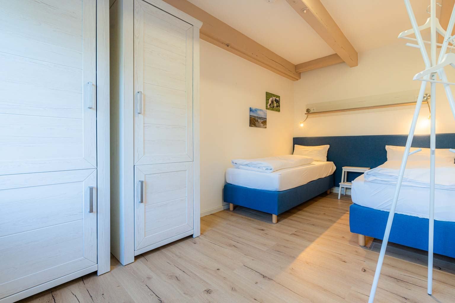 Schlafzimmer mit 2 Einzelbetten (je 80x200cm), Kleiderschränken und Garderobenständer.
