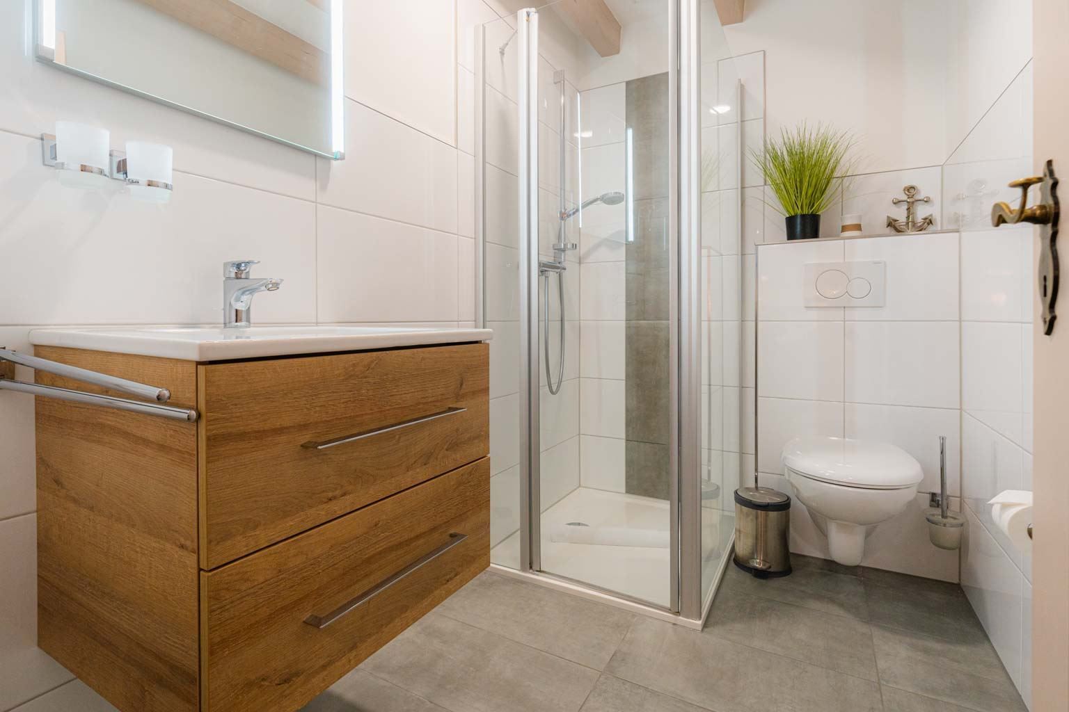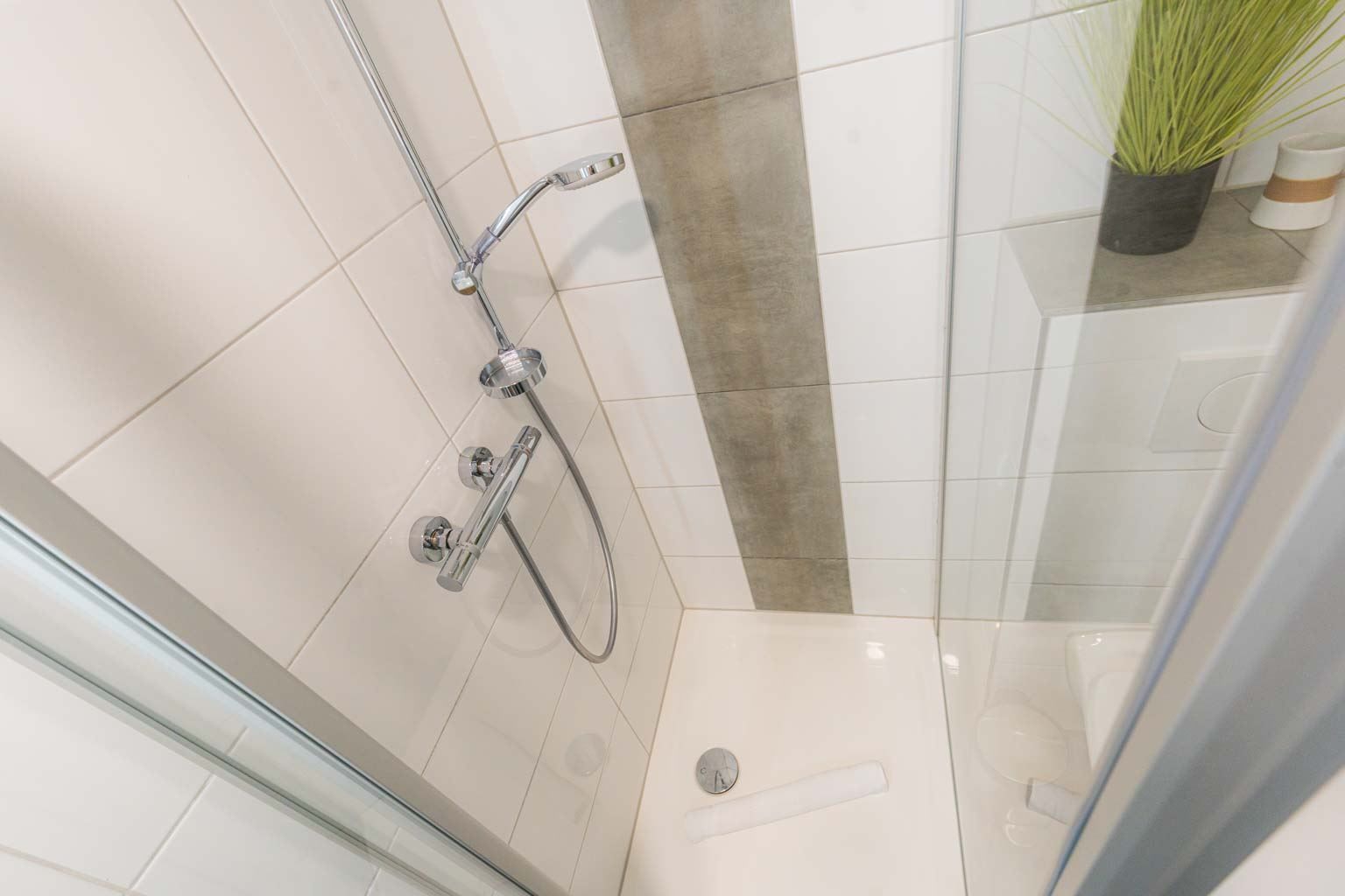 Badezimmer (Duschbad) mit bodengleicher Dusche, WC, Handtuchwärmer und Föhn.
