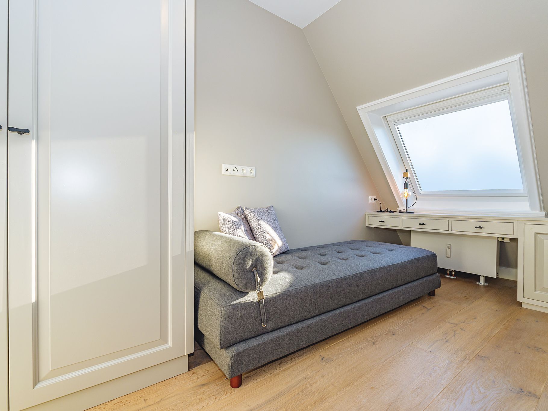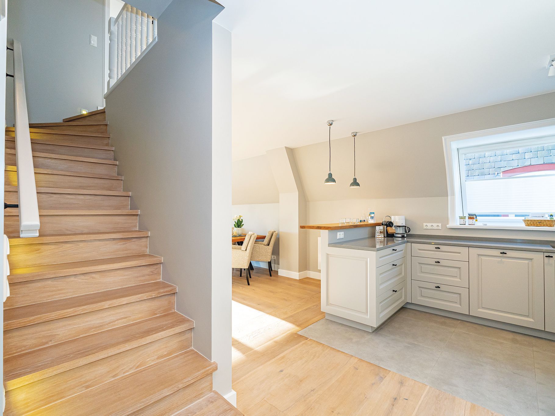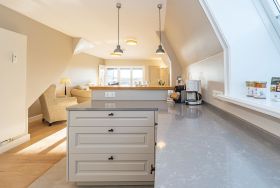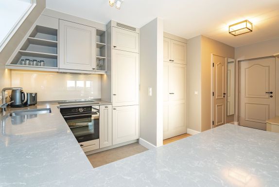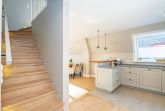 Dieses zauberhafte Quartier für Drei erwartet Sie im 1. OG eines gepflegten Appartementhauses in der Kurhausstraße. Der Eingangsbereich mit Gäste-WC schließt direkt an die elegante offene Küche und den kombinierten WohnEssbereich an. Hier überzeugt sofort der tolle Panoramaausblick über die Kampener Heidelandschaft vom Leuchtturm Langer Christian bis hin zur Uwe Düne, sowie der gemütlich geschützte Südbalkon. Der gleiche schöne Ausblick erfreut im Einzelschlafzimmer mit französischem Bett und Chaiselongue im Obergeschoss des Quartiers. Ein weiteres Schlafzimmer für Zwei und je ein Dusch- und Wannenbad, sowie hochwertige Tischlereinbauten in einheitlichem Stil komplettieren diese Etage. Das gesamte Quartier ist frisch renoviert und verkörpert eine moderne Interpretation des Landhausstils in Grau- und Weißtönen mit schmuckem Holzfußboden.