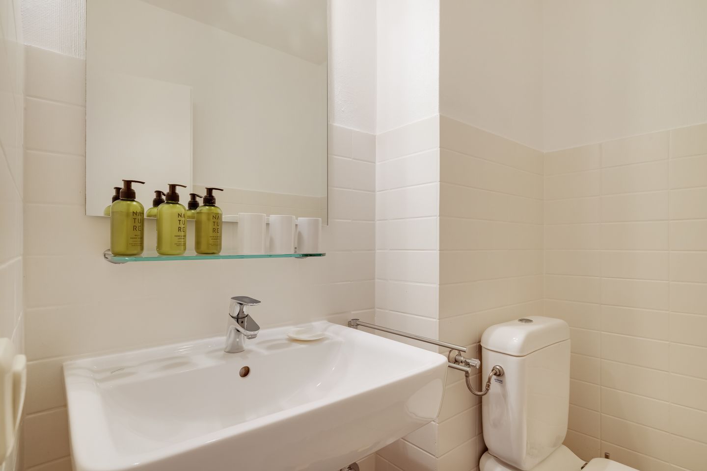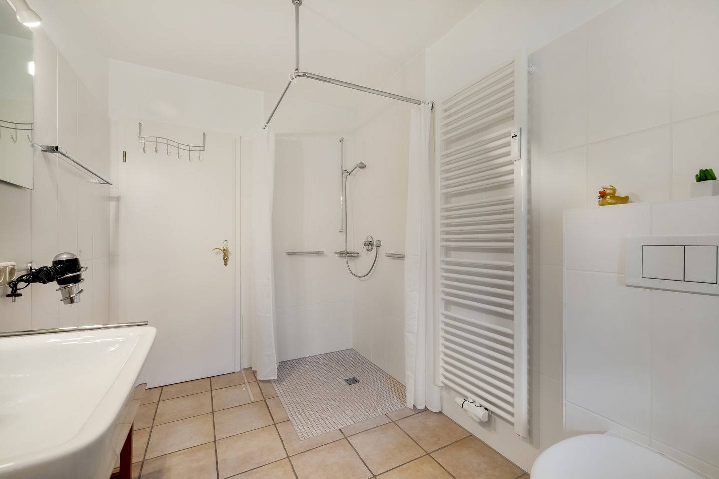 Badezimmer: weißes Bad mit ebenerdiger Dusche, Handtuchhalter, Kosmetikspiegel und Fön
