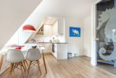 Küche: kleine offene Einbauküche mit Geschirrspüler, Backofen, Nespresso-Kaffeemaschine etc.
