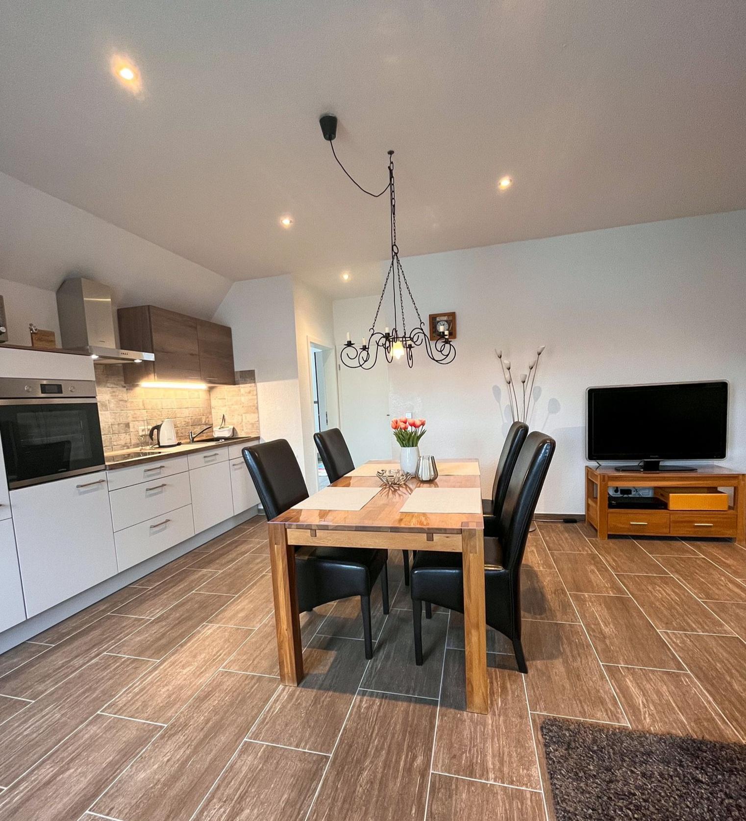 Durch ein großes Wohn-/Esszimmer mit moderner Küchenzeile und großem Esstisch, kommen Sie direkt ins Badezimmer mit bodentiefer Dusche und WC sowie in ein separates Gäste-WC.