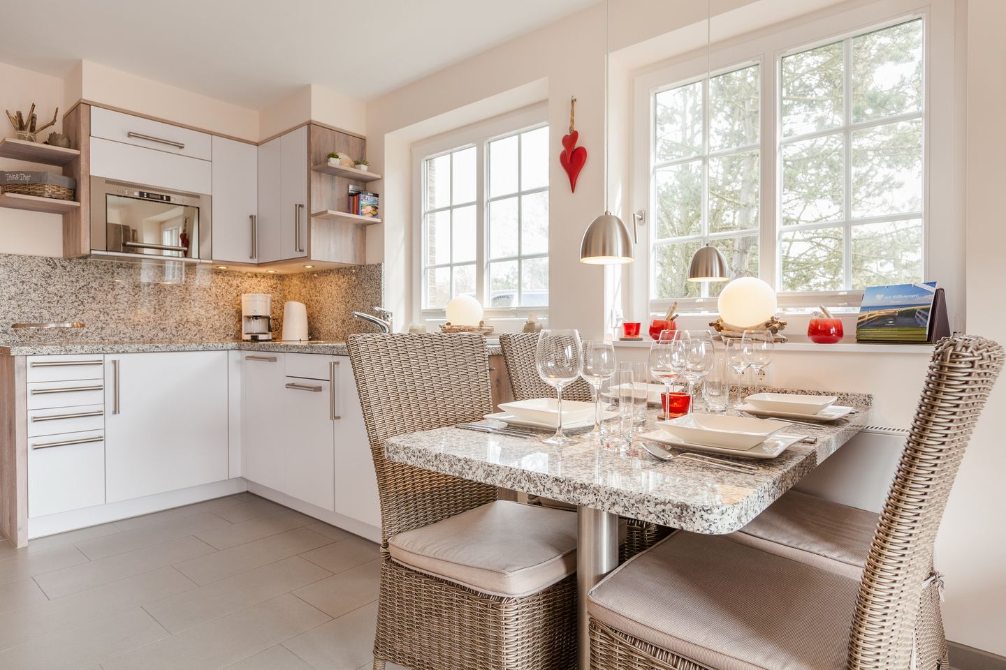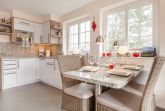 Der helle Wohnraum des Domizils ist mit viel Liebe zum Detail eingerichtet und bietet Ihnen eine gemütliche Couch, einen Essbereich für bis zu vier Personen sowie eine moderne, offen gestaltete Küchenzeile. Vom Wohnbereich aus betreten Sie Ihre wunderschöne, möblierte Süd-Terrasse mit Blick in den idyllischen Garten. Die Sonne können Sie hier bis in die Abendstunden ausgiebig genießen. Im Erdgeschoss finden Sie außerdem ein kleines Gäste-WC.