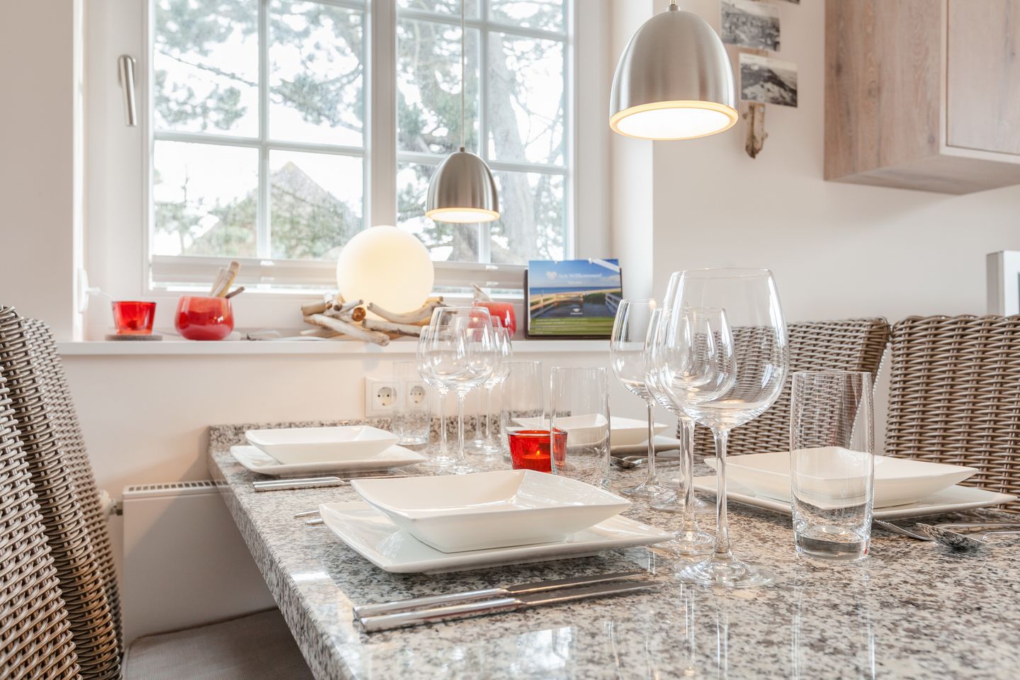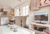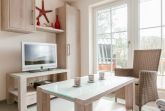 EG: Wohn-/Essbereich mit Flatscreen-TV, iPod Dockingstation, Radio, Stereoanlange, Telefonflatrate ins deutsche Festnetz und WLAN, integrierte Küchenzeile mit kombinierter Microwelle/Backofen, Geschirrspülmaschine, Wasserkocher und Kaffeemaschine, kleines Gäste-WC, sonnige Süd-Terrasse mit Gartenmöbeln und Strandkorb (möbliert ca. von April-Oktober)