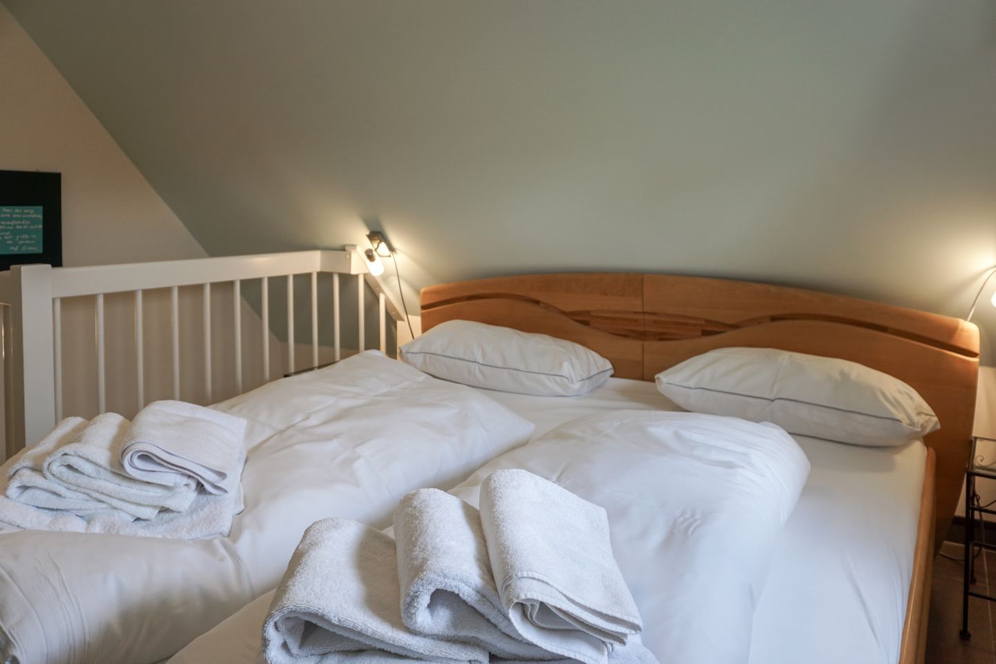 Im Obergeschoss auf gleicher Ebene finden Sie ein Tageslichtbadezimmer mit Dusche und WC. Im Dachgeschoss erwartet Sie ein weiterer Raum, der mit einem Doppelbett ausgestattet ist.