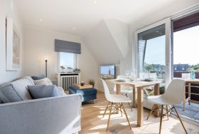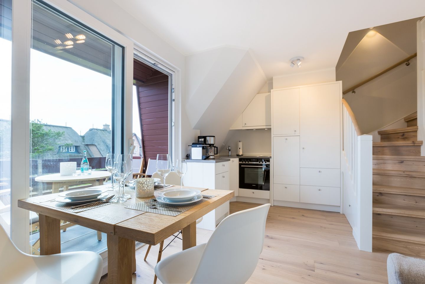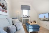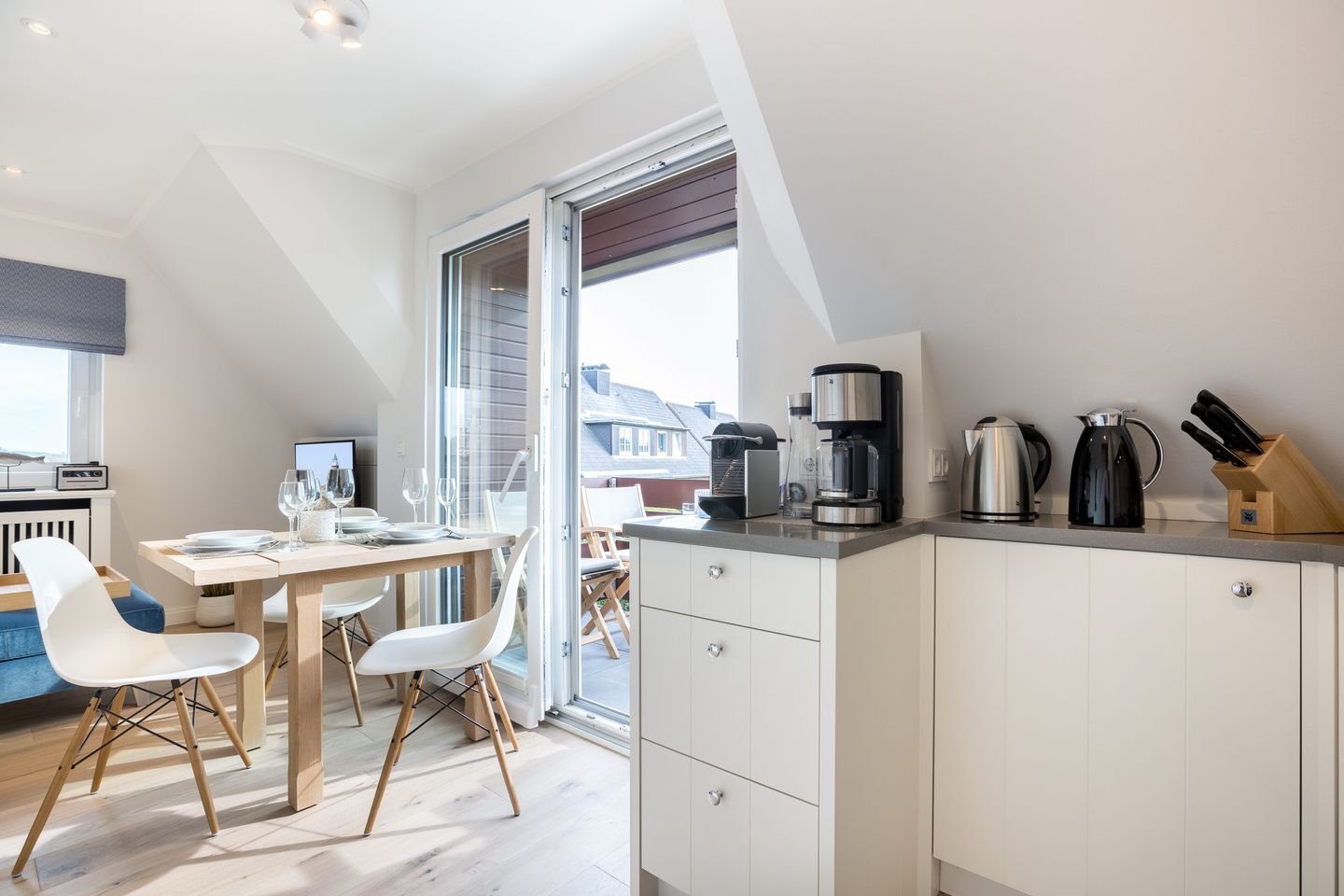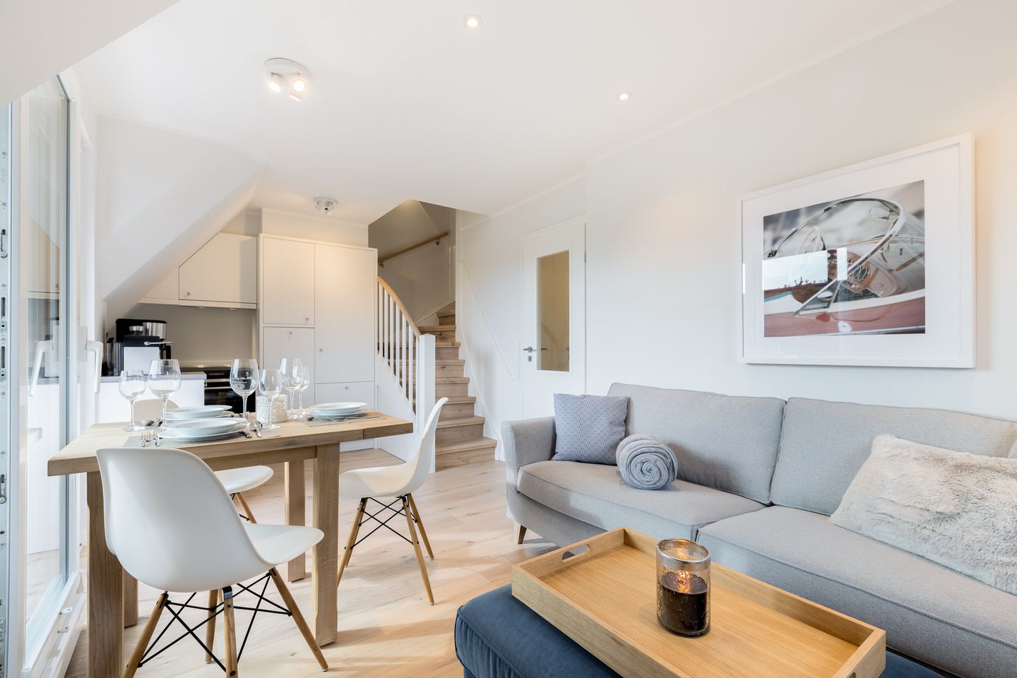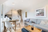 Der Wohnraum des Appartements bietet Ihnen eine gemütliche Couch, einen Flatscreen-TV und einen Essbereich. Die offene Küche verfügt über einen Geschirrspüler, Backofen, Induktionsherd und zwei Kaffeemaschinen und ist somit mit allem ausgestattet, was das Urlaubsherz begehrt. Vom Wohnraum aus können Sie Ihren Balkon betreten, der im Sommer mit Gartenmöbeln ausgestattet ist. Auf gleicher Ebene finden Sie ein Schlafzimmer mit einem Boxspring-Doppelbett und Flatscreen-TV. Ebenfalls im Obergeschoss befindet sich das Tageslichtbadezimmer mit Dusche und WC.
