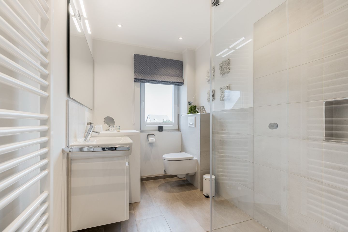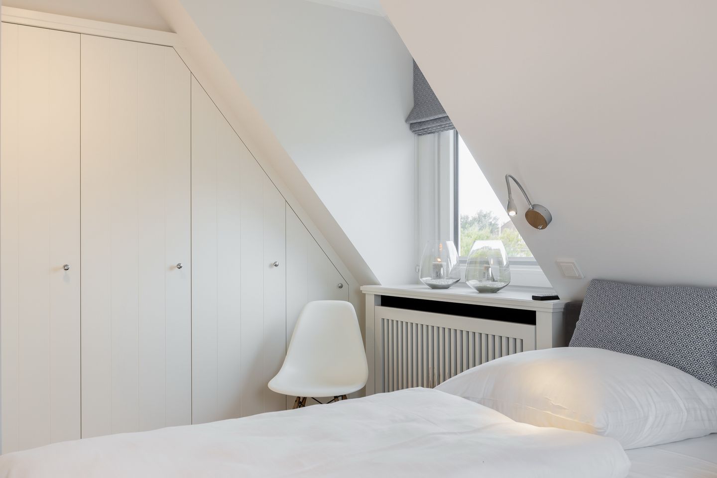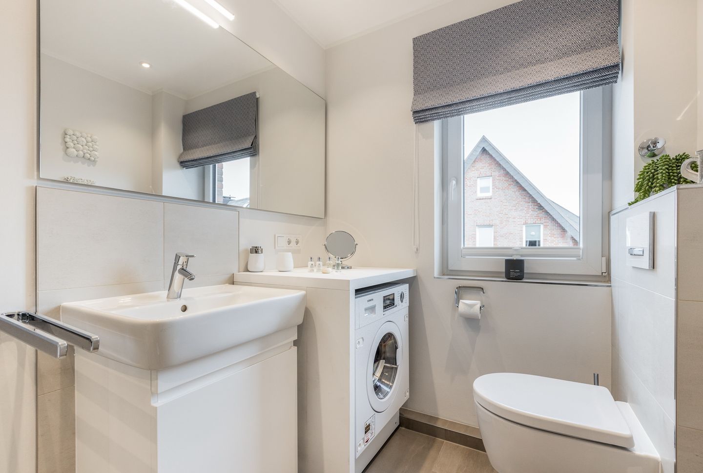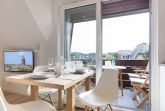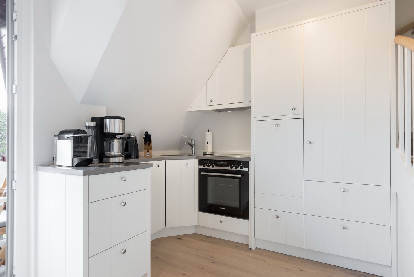 Der Wohnraum des Appartements bietet Ihnen eine gemütliche Couch, einen Flatscreen-TV und einen Essbereich. Die offene Küche verfügt über einen Geschirrspüler, Backofen, Induktionsherd und zwei Kaffeemaschinen und ist somit mit allem ausgestattet, was das Urlaubsherz begehrt. Vom Wohnraum aus können Sie Ihren Balkon betreten, der im Sommer mit Gartenmöbeln ausgestattet ist. Auf gleicher Ebene finden Sie ein Schlafzimmer mit einem Boxspring-Doppelbett und Flatscreen-TV. Ebenfalls im Obergeschoss befindet sich das Tageslichtbadezimmer mit Dusche und WC.