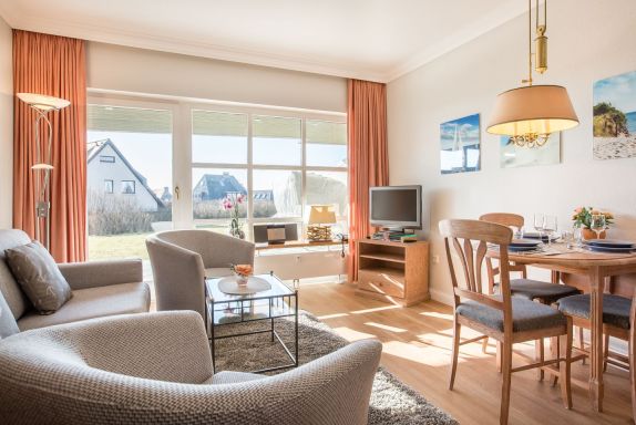 EG: schöner Wohnraum mit Kabel-TV, WLAN, DVD- und CD-Player und Radio. Gemütliche Sitzecke. Integrierte Küche mit Microwelle und Geschirrspüler. Schöne Süd-Terrasse mit Strandkorb (ca. von April–Oktober).