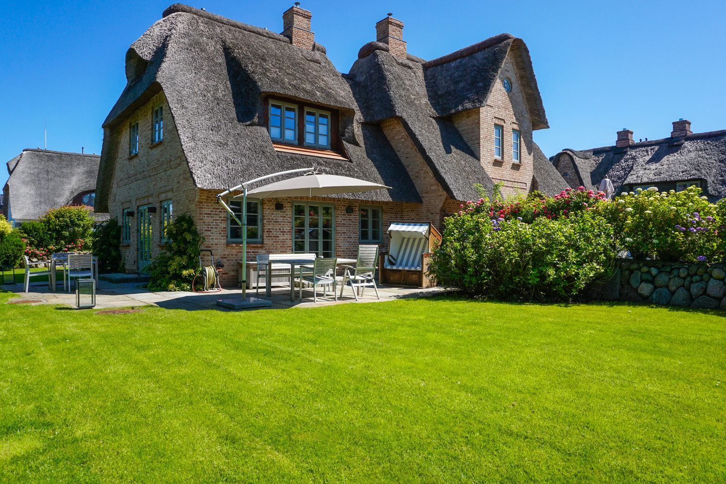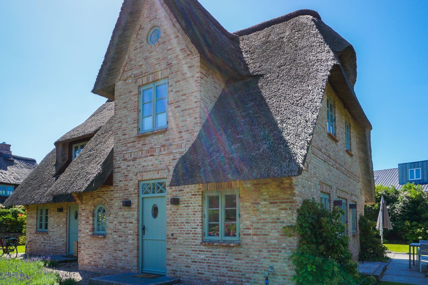 In ruhiger Lage Wenningstedts gelegenes Luxushausteil unter Reet. Ca. 121 qm Nutzfläche empfangen bis zu 6 Gäste im Erd-, Unter- sowie Obergeschoss.