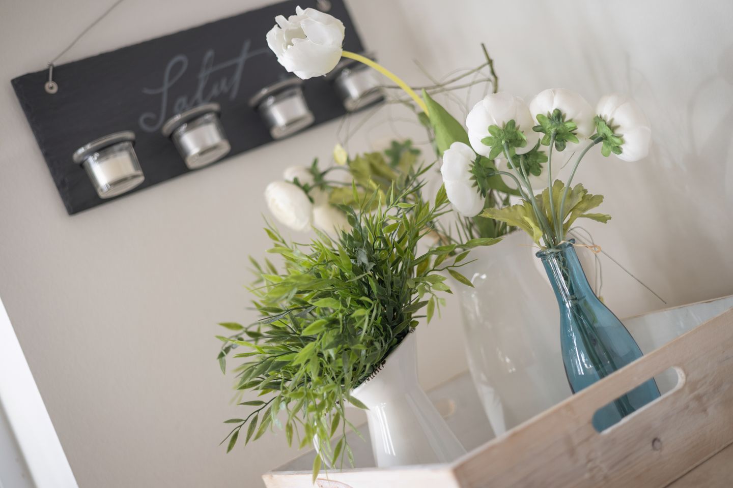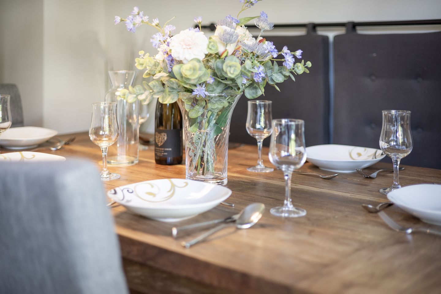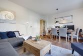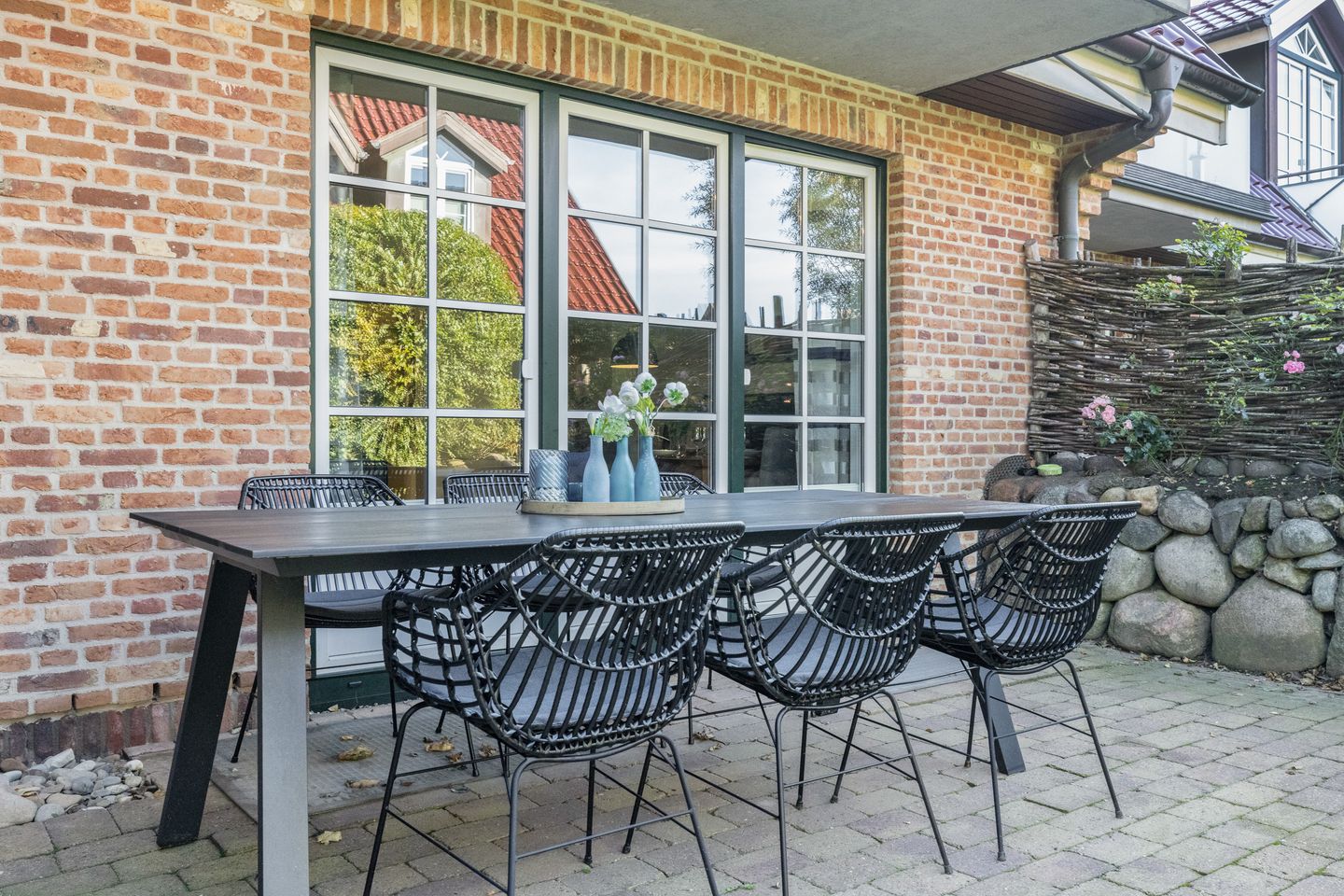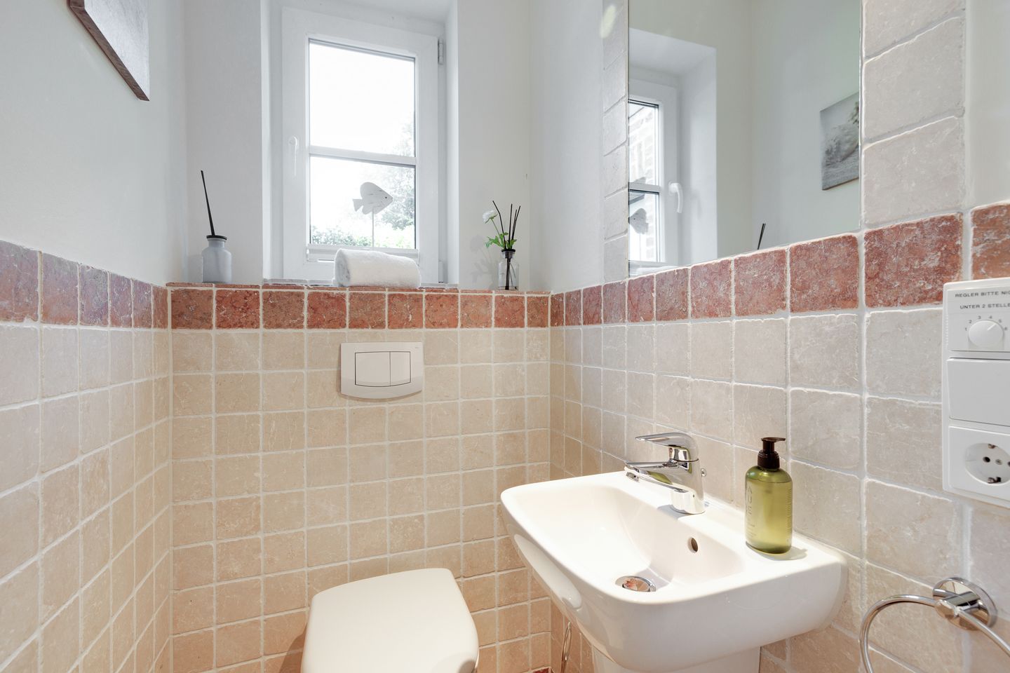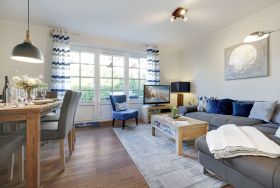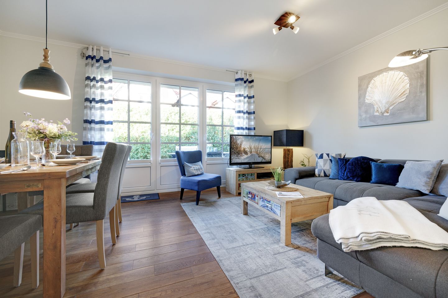 Im Erdgeschoss des Hausteiles erwartet Sie ein heller, gemütlicher Wohnbereich mit großzügiger Essecke und Wohnlandschaft. Von hier aus können Sie direkt auf Ihre im Sommer möblierte Terrasse hinausgehen und die Sylter Sonnenstrahlen genießen. Die Küche der Ferienwohnung befindet sich ebenfalls im Erdgeschoss und ist mit Geschirrspüler, Backofen und vielem mehr ausgestattet, sodass Sie sich problemlos das Familien-Dinner zubereiten können. Auf gleicher Ebene finden Sie außerdem ein Gäste-WC.