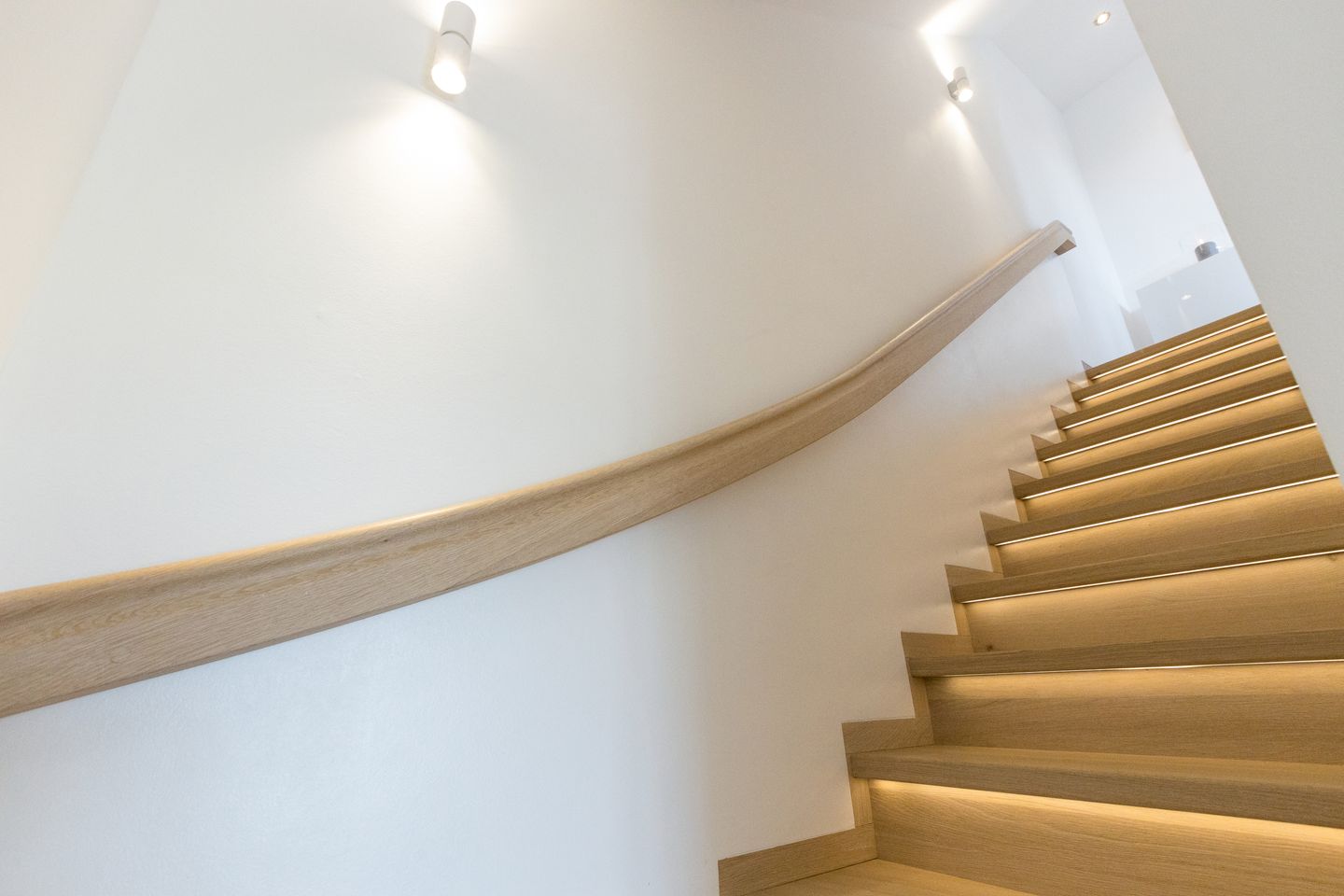 Über die aufwendig ausgeleuchtet Treppe kommen Sie ins Warftgeschoss.