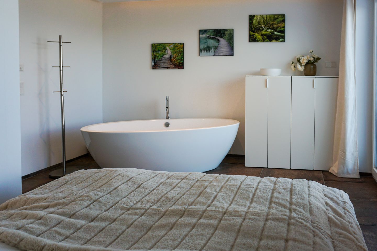 Das Warftgeschoss ist eine Mischung aus Wellnessbereich, Badezimmer ( Dusche und WC ) und Schlafzimmer mit bodentiefen Fenstern mit Blick auf den Garten und den Strandhafer.