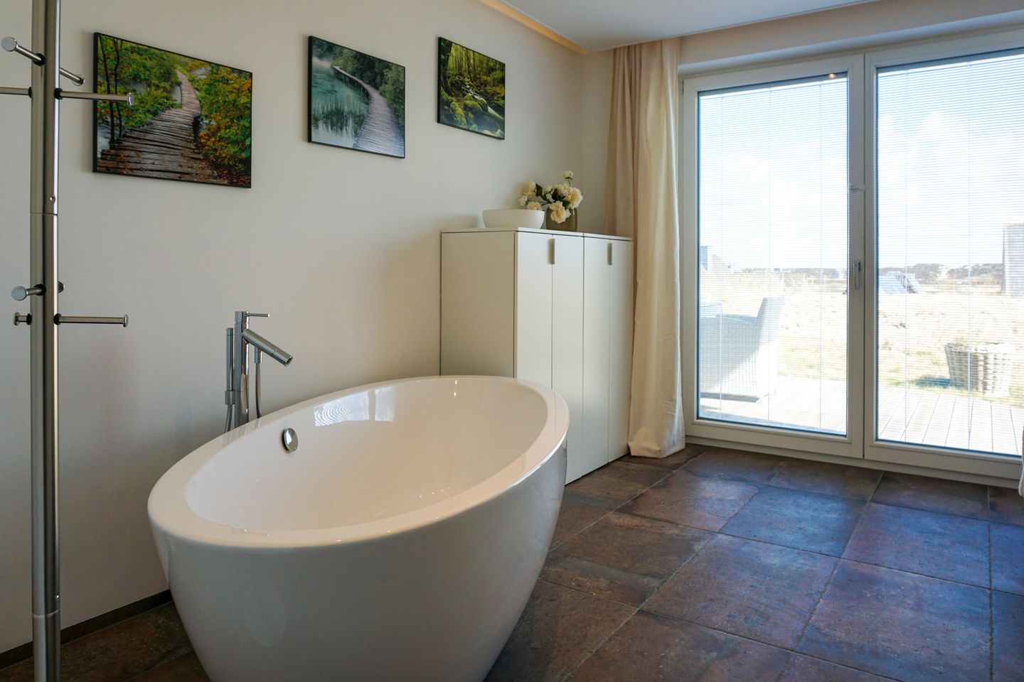 Eine freistehende Badewanne bietet Ihnen vollen Entspannungsgenuss. Von der großen Sauna aus können Sie direkt über die Holzterrasse ins Freie zum Abkühlen gelangen.