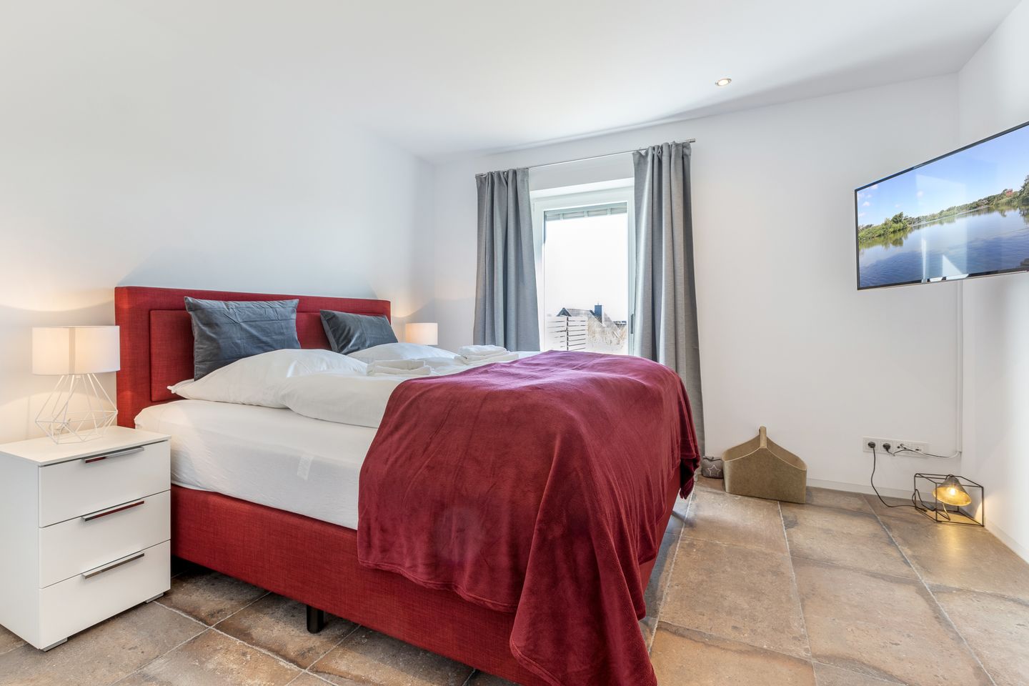 Auch hier gibt es einen Flatscreen-TV. Das zweite Doppelbett verfügt über einen offenen Fußteil und ist 160x200cm.