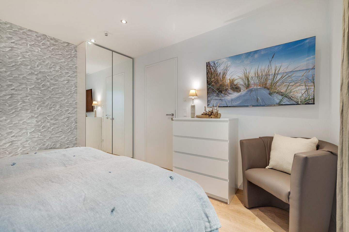 Mittelpunkt der Wohnung ist der offen gestaltete Wohn- und Essbereich mit hochwertigen Möbeln und einem Gaskamin, der auch an verregneten Tagen für Gemütlichkeit sorgt. Zum Wohnbereich gehört außerdem eine moderne Küchenzeile mit Geschirrspülmaschine, Backofen und Induktionskochfeld. Vom Wohnbereich aus erreichen Sie Ihre Terrasse von der aus Sie sowohl das Wattenmeer als auch den Weststrand der Insel bewundern können.