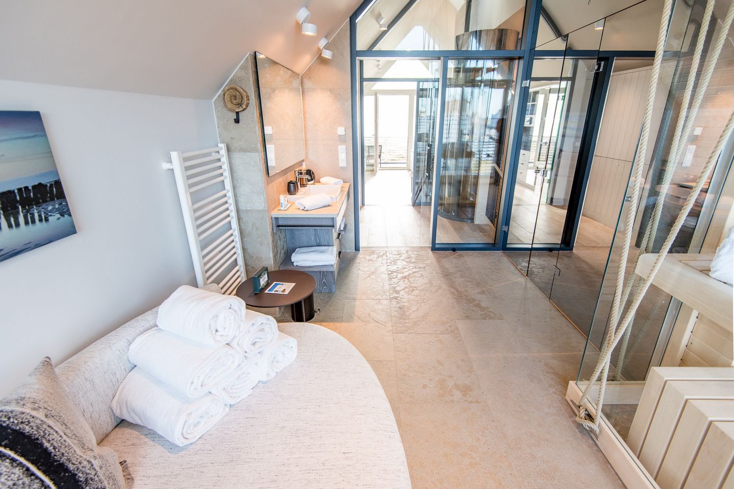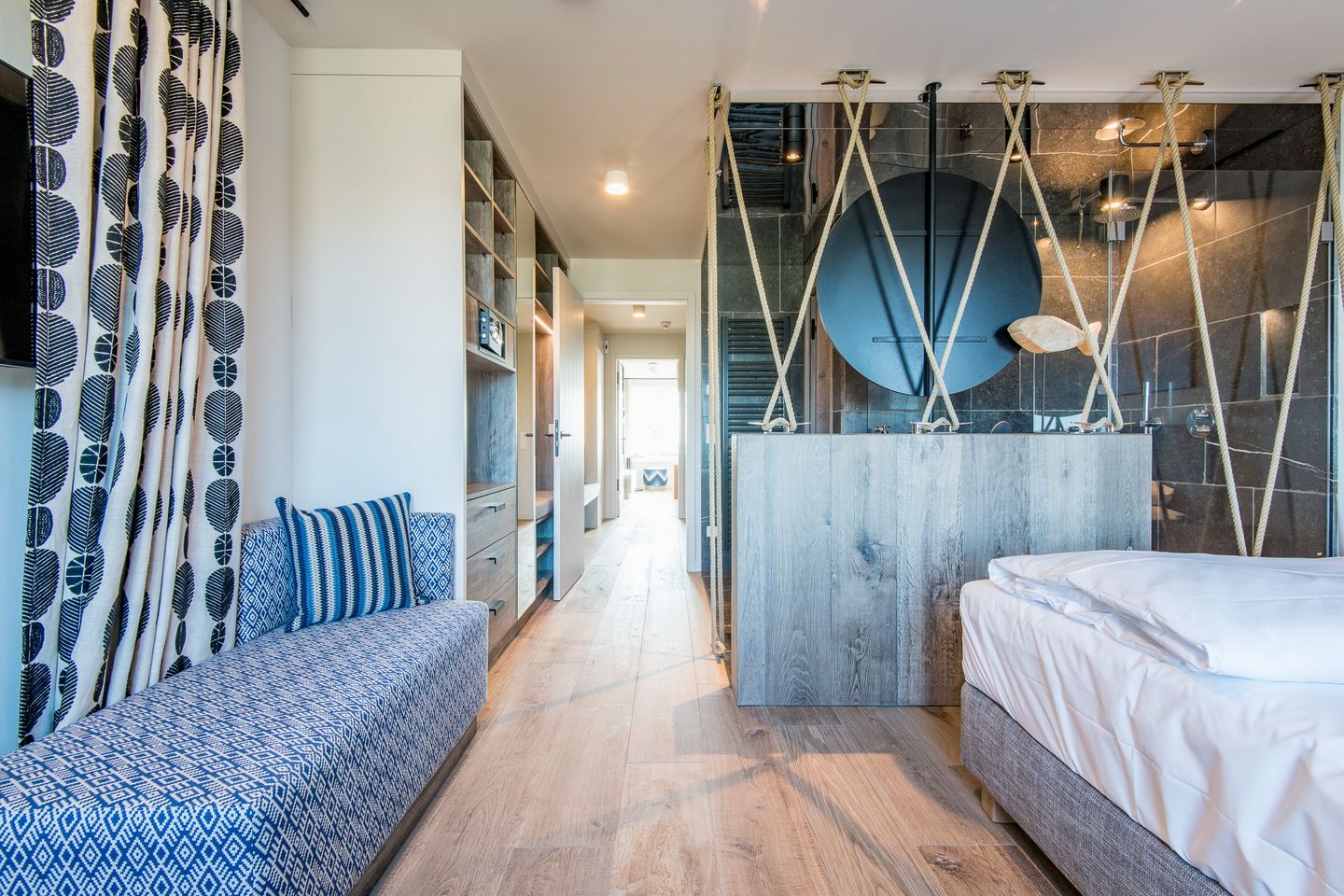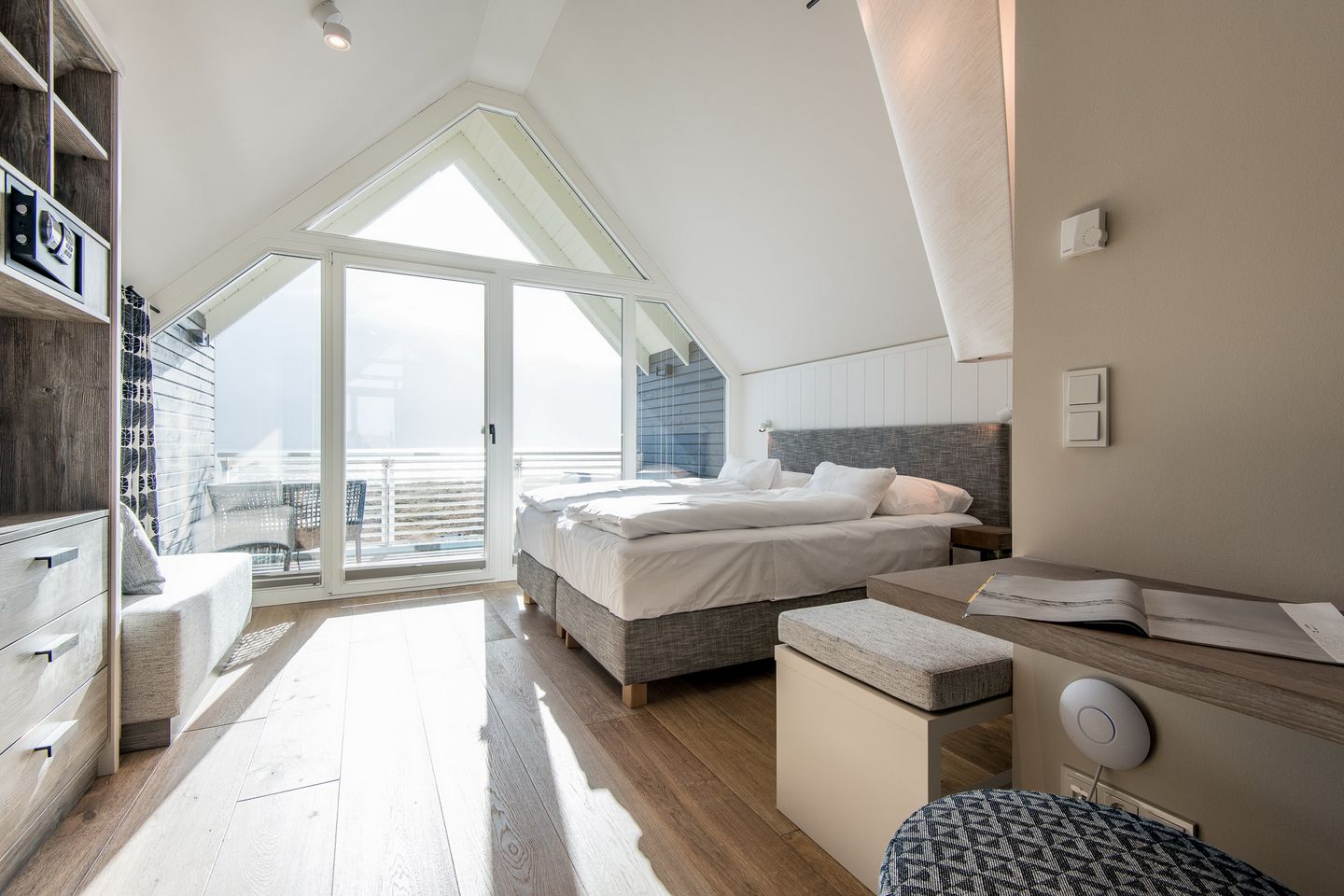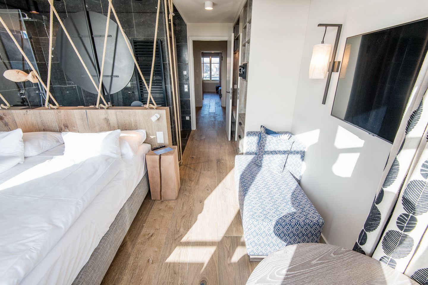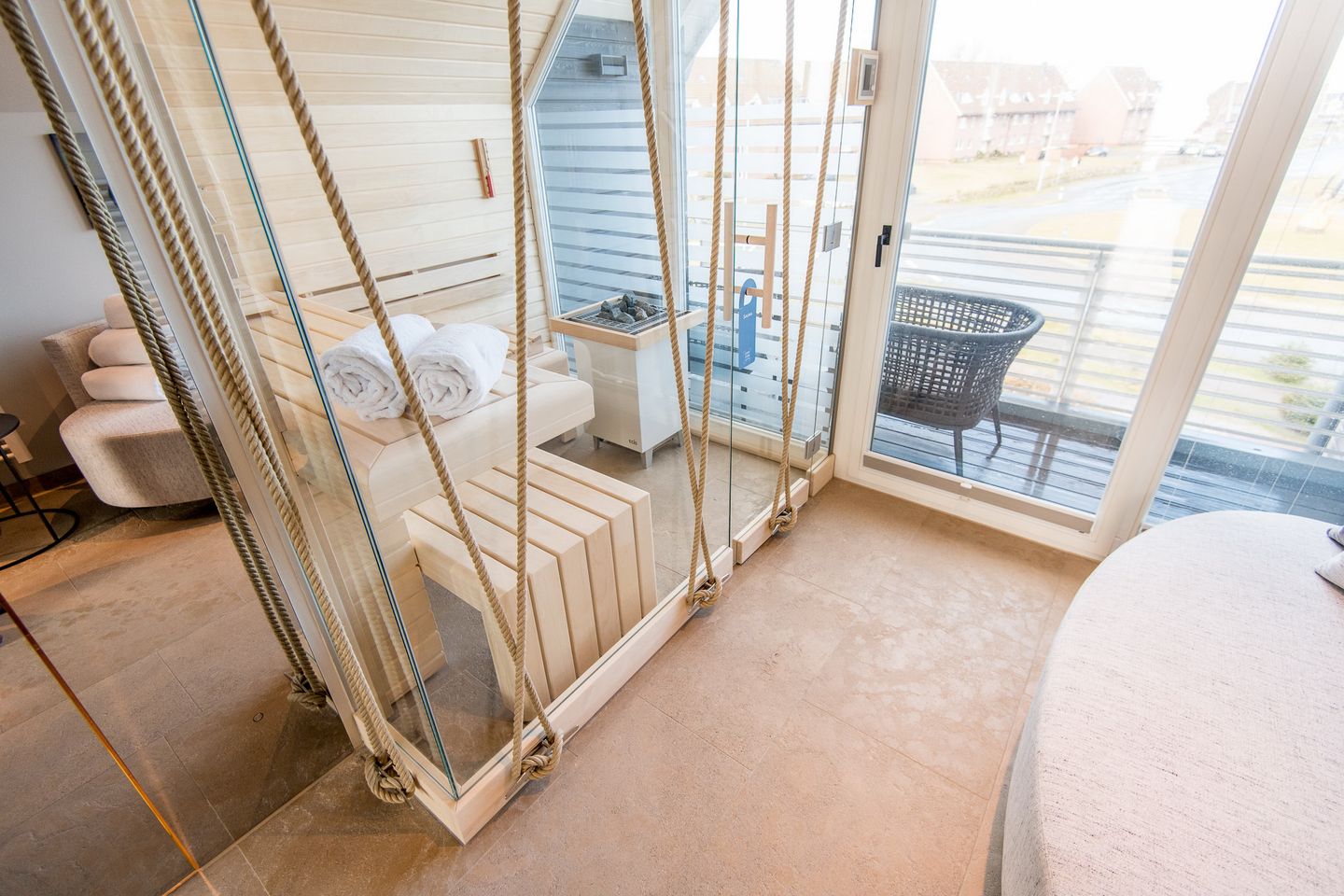 DG: ein Raum mit Doppelbett und TV, eigener Balkon, offenes Duschbad mit separatem WC, Saunabereich mit Balkon.