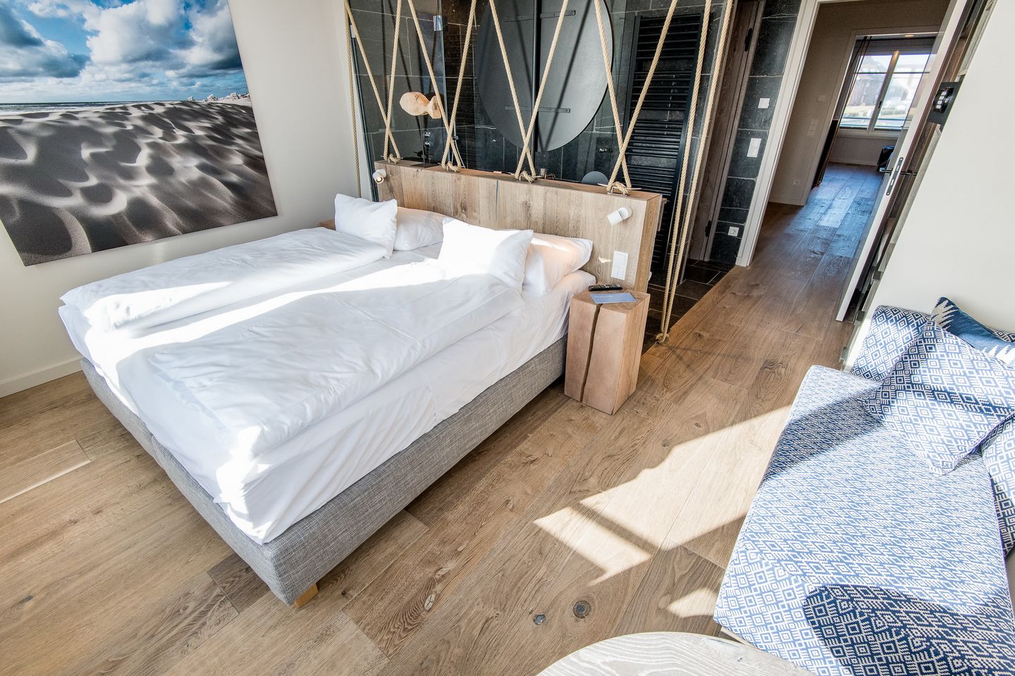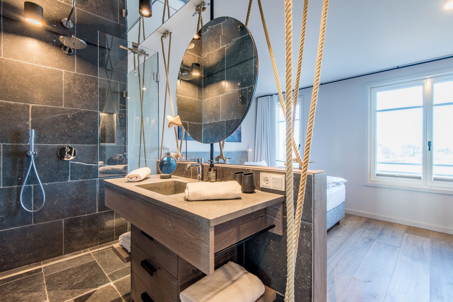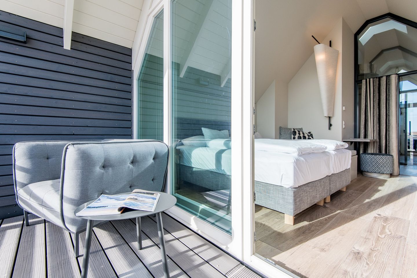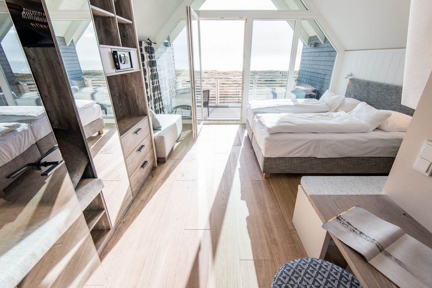 DG: ein Raum mit Doppelbett und TV, eigener Balkon, offenes Duschbad mit separatem WC, Saunabereich mit Balkon.