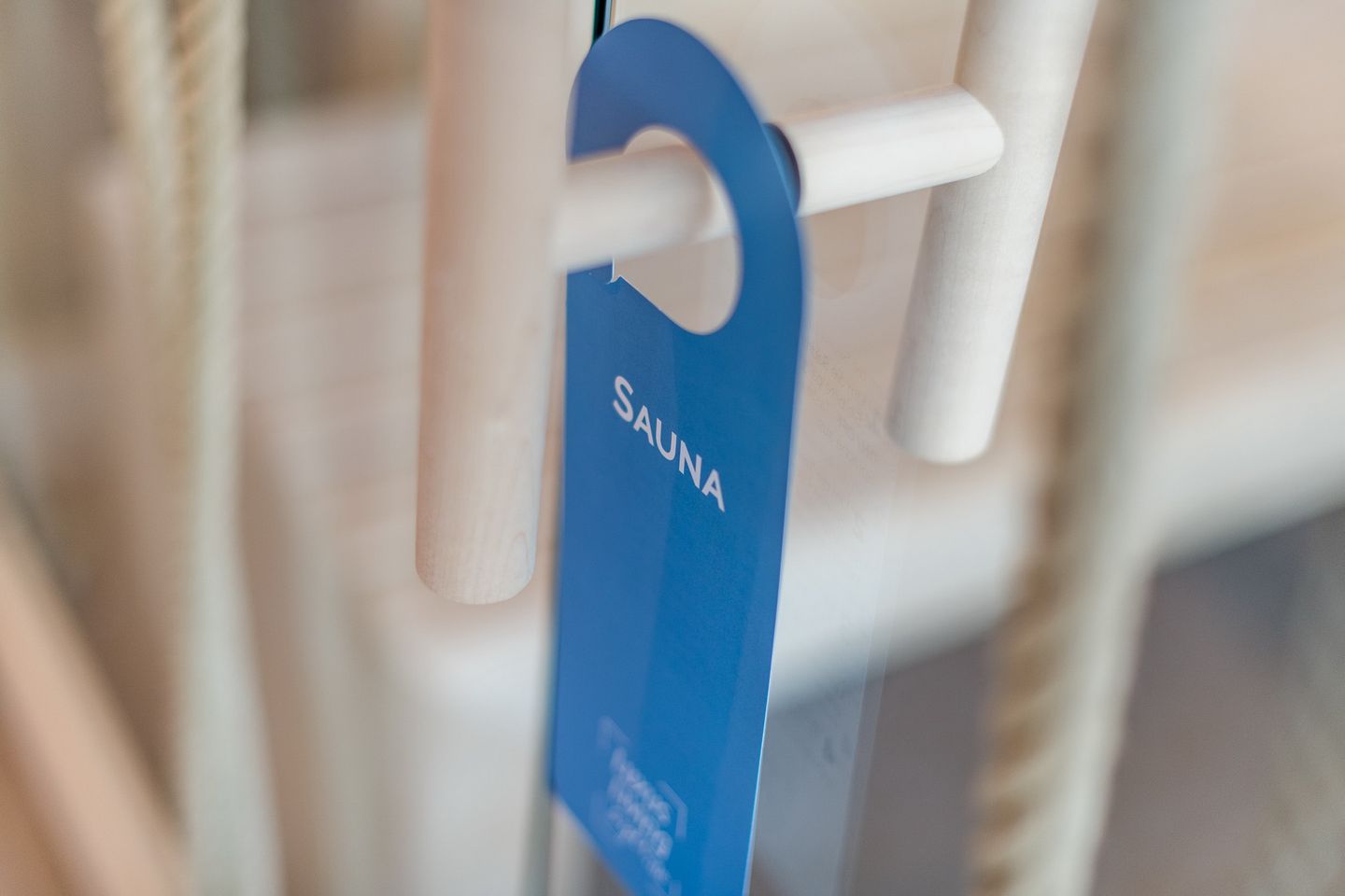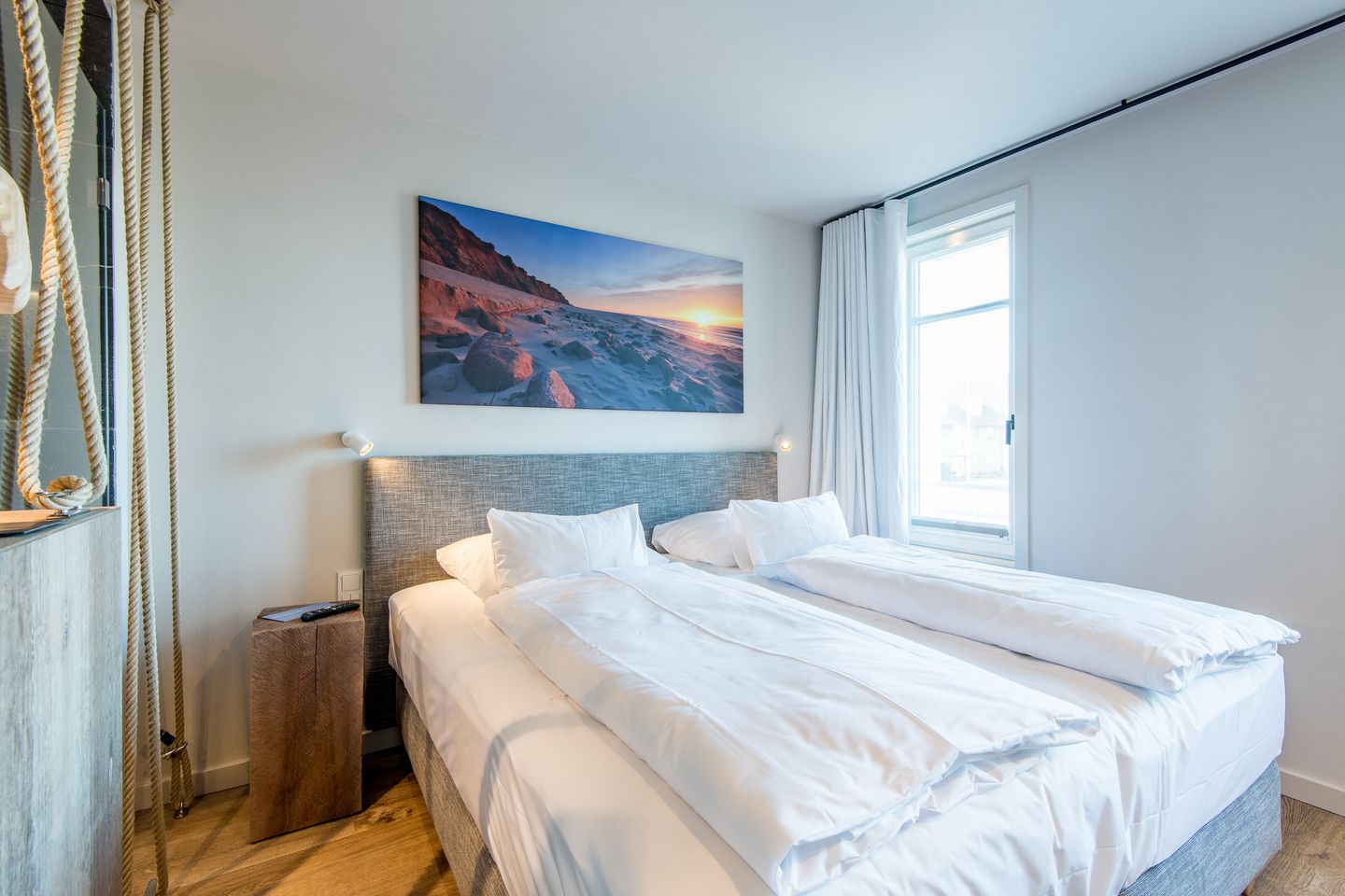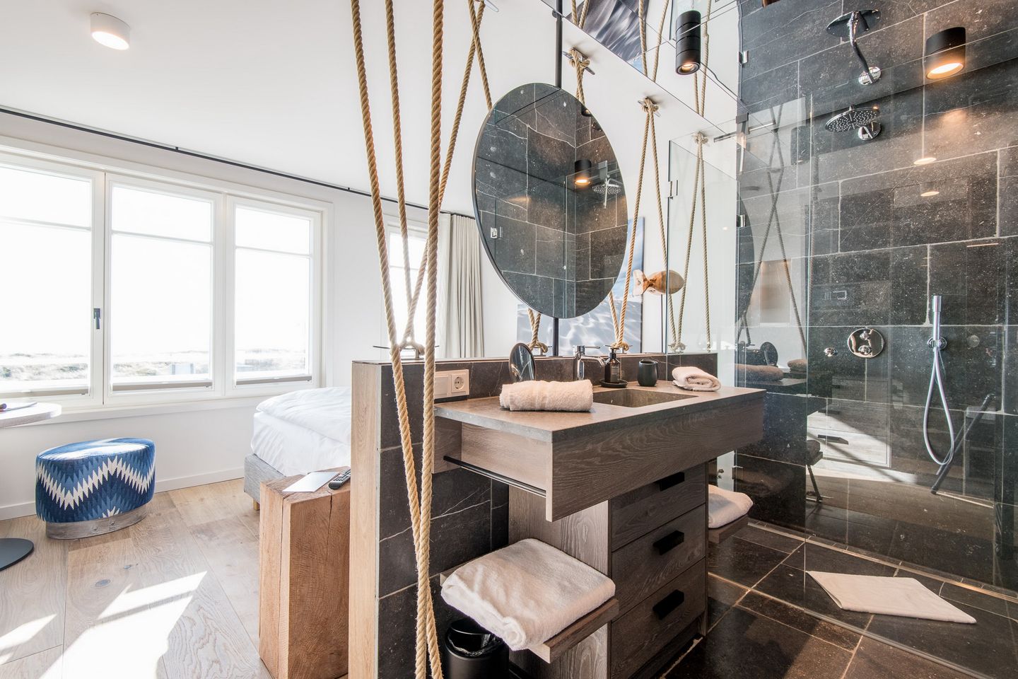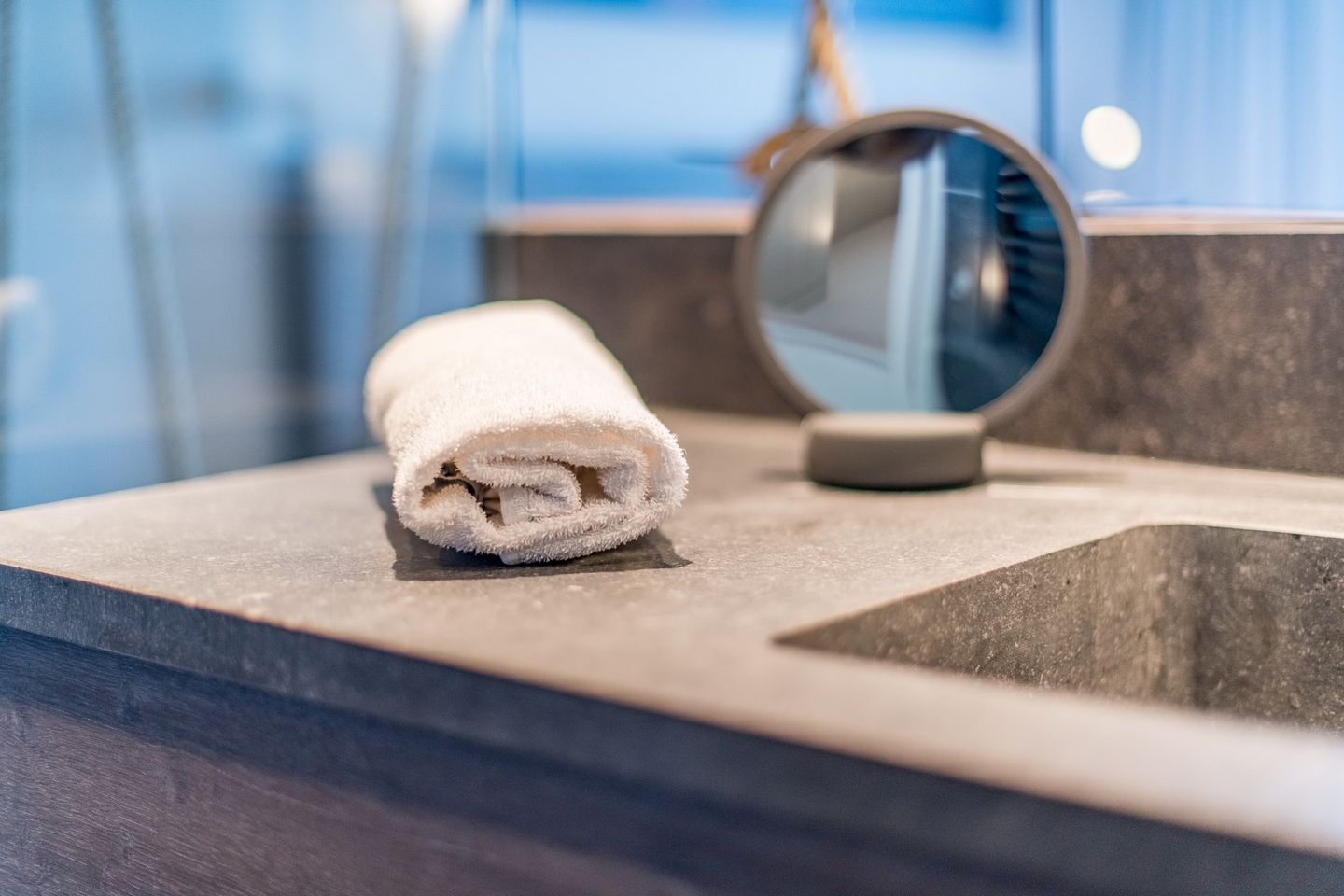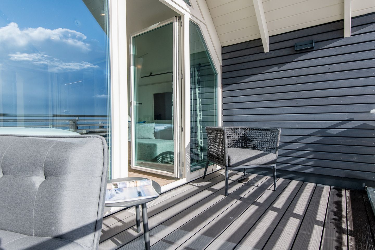DG: ein Raum mit Doppelbett und TV, eigener Balkon, offenes Duschbad mit separatem WC, Saunabereich mit Balkon.