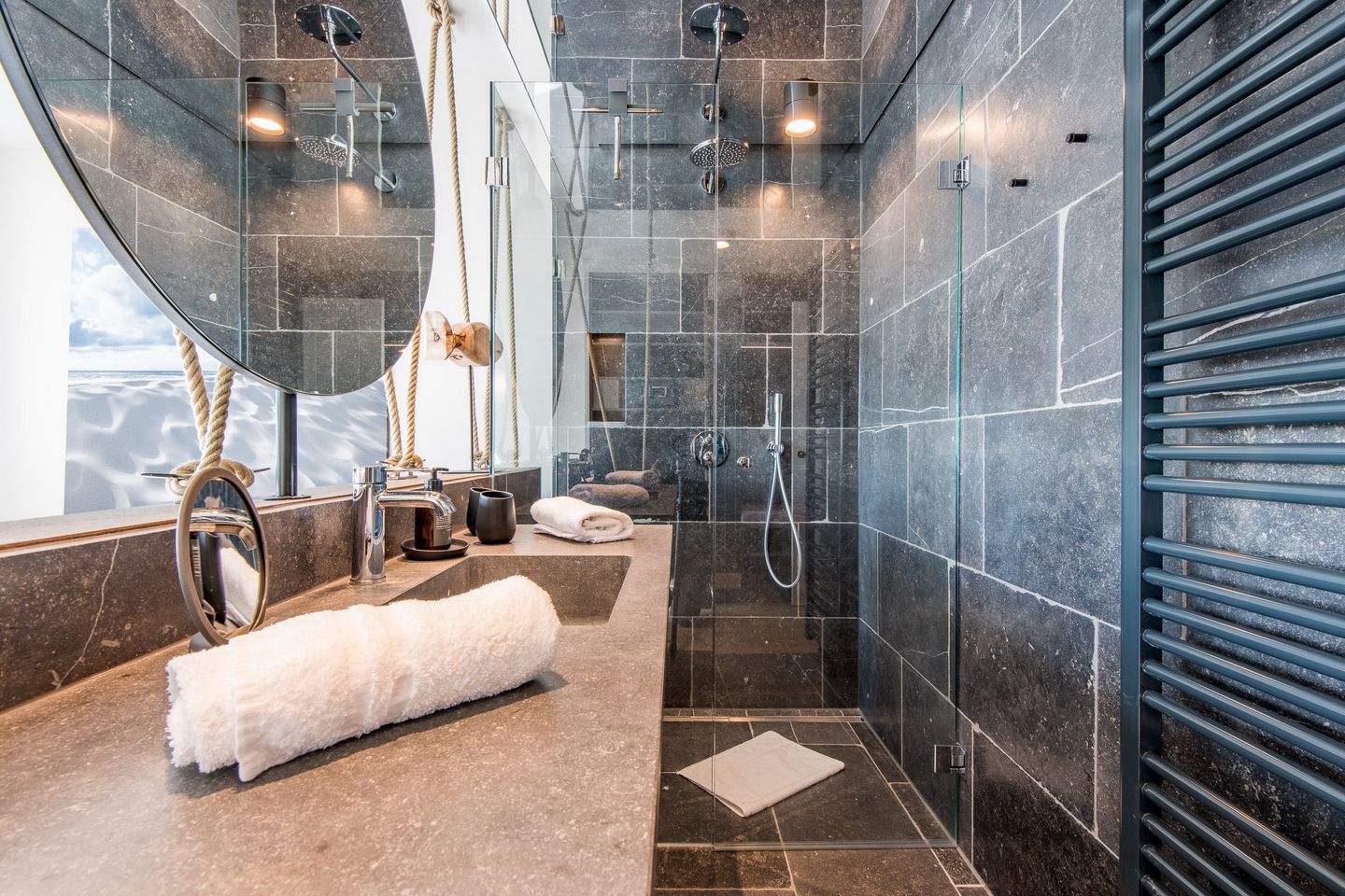 OG: zwei Räume mit Doppelbett, TV und offenem Duschbädern und separatem WC.