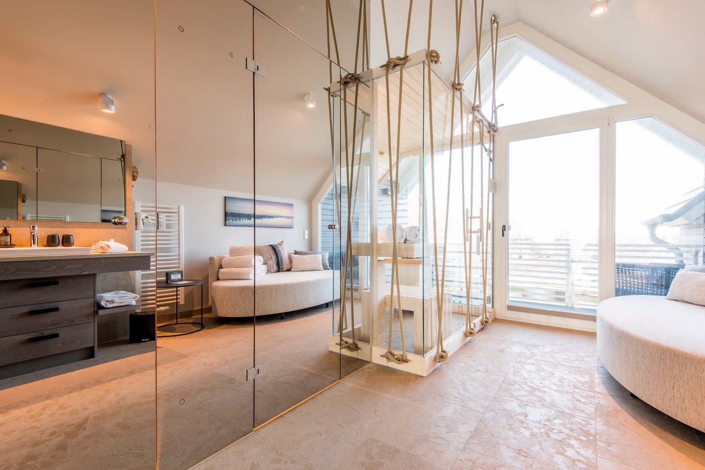 So etwas finden Sie auf Sylt nicht so häufig! Ein einmaliger Meerblick aus mehreren Etagen, eine Dünenterrasse und zwei Balkone, lichtdurchflutete Räume, ein runder Gaskamin im Wohnraum, ein eigener Aufzug durch sämtliche Etagen, offene Badezimmer, hochwertige Tischlereinbauten, zwei Tiefgaragenstellplätze mit eigenem Zugang ins Haus und und und. An jeder Ecke gibt es WOW-Effekte! Wir können uns auf jeden Fall nicht sattsehen - Sie hoffentlich auch nicht!
