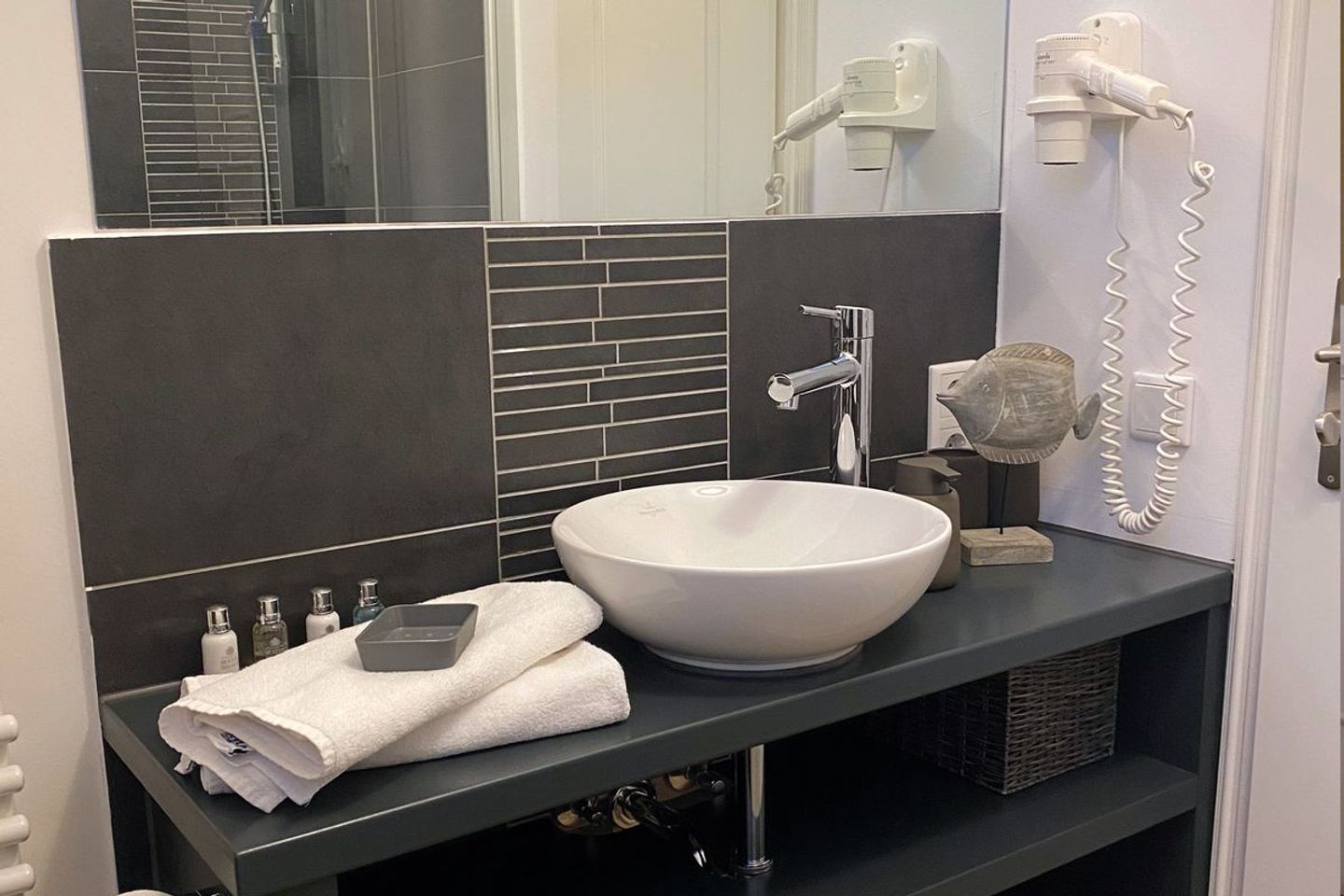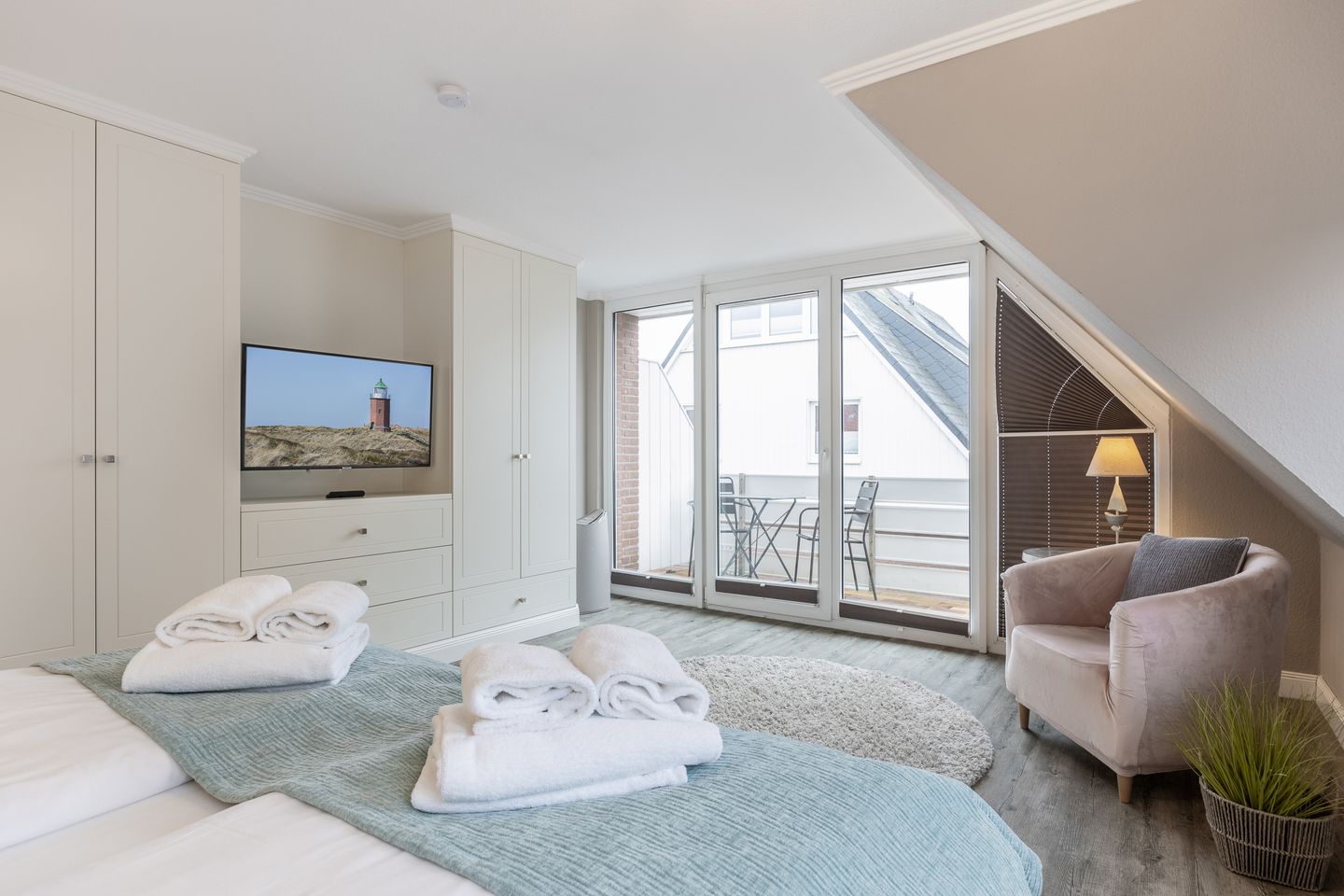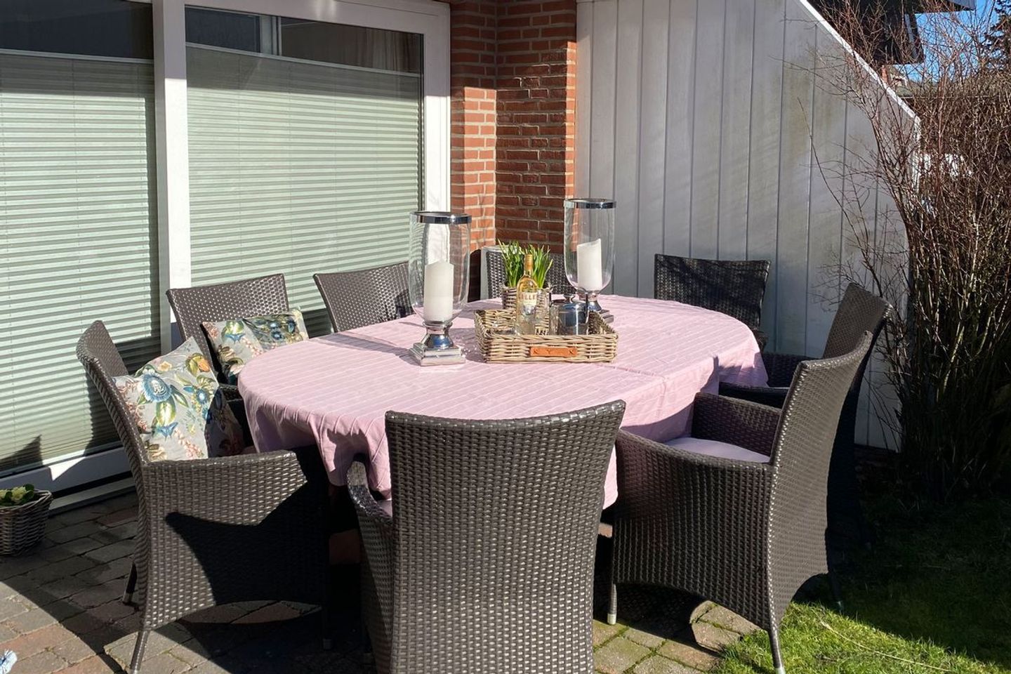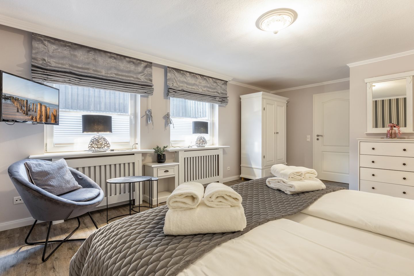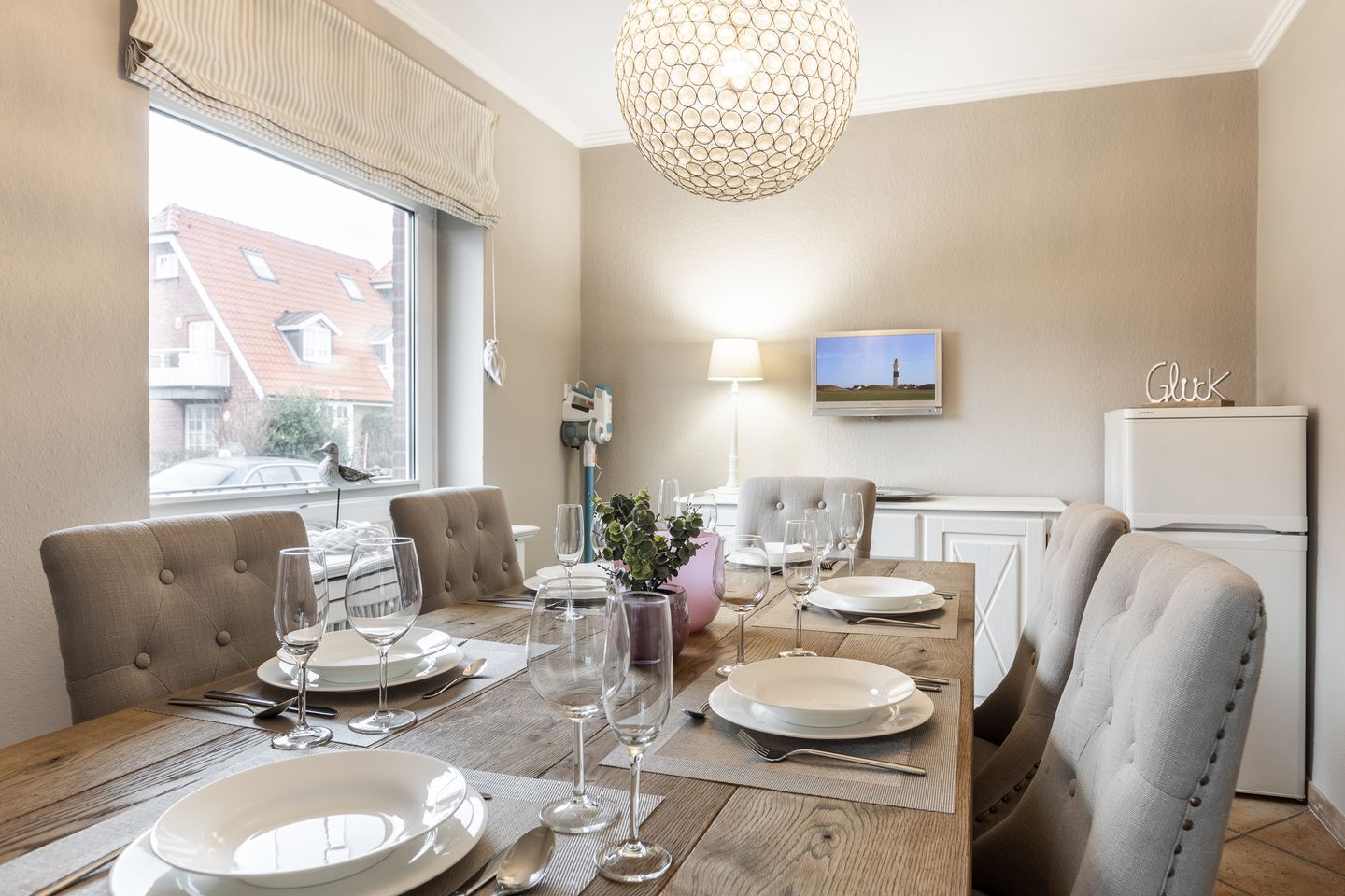 Im Erdgeschoss erwartet Sie das Wohnzimmer mit seiner großen Sitzecke und daran an grenzt die durch einen kleinen Tresen abgetrennte Küche, in welcher auch eine Nespresso-Maschine auf Sie wartet. Das separate Esszimmer bietet Platz genug für eine Großfamilie und ist wie auch das Wohnzimmer mit einem TV ausgestattet. Bei schönem Wetter lädt auch die Süd-Terrasse mit Gartenmöbeln und Strandkorb zum draußen sitzen ein. Genießen Sie schon zum Frühstück die Sonne auf der Terrasse.