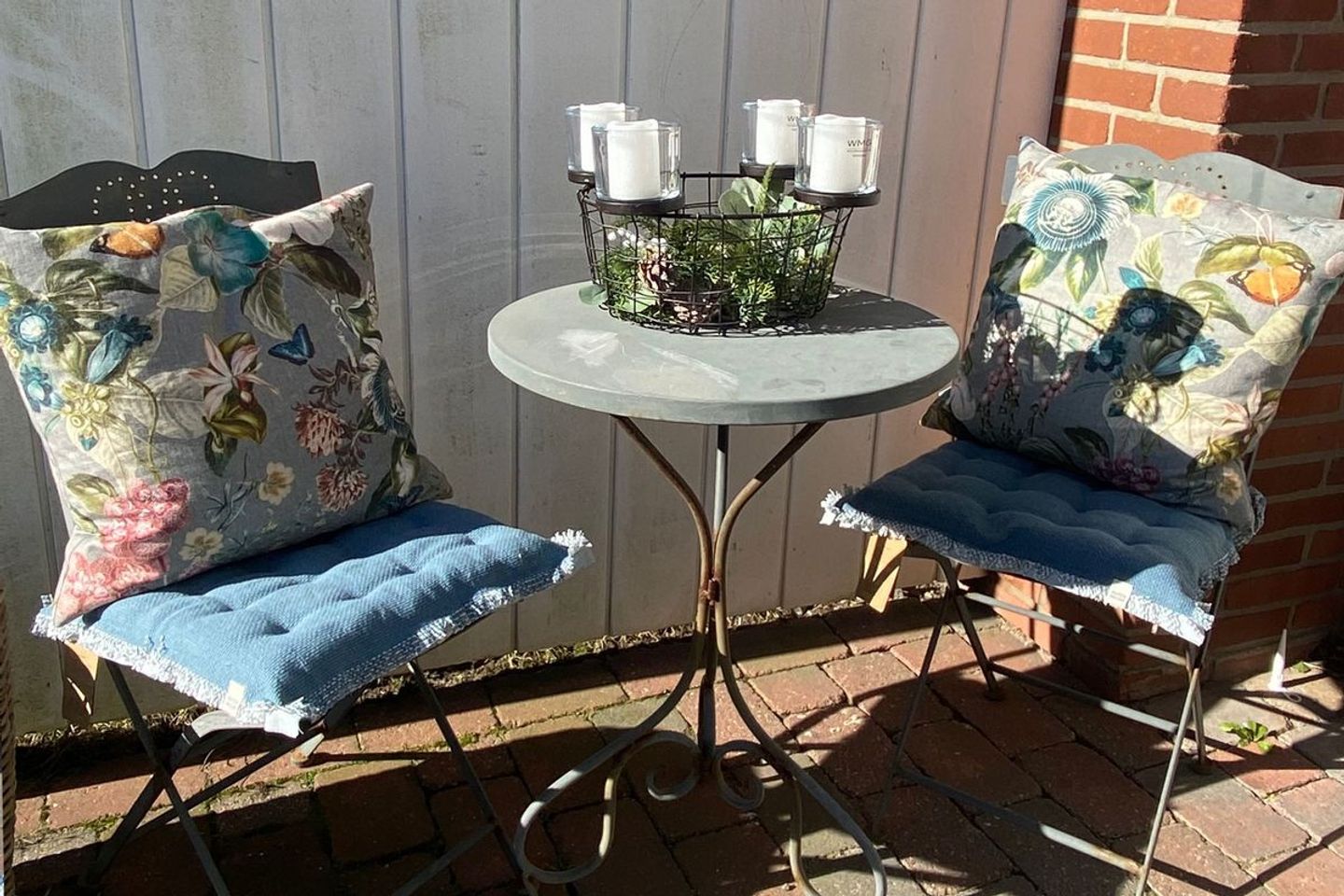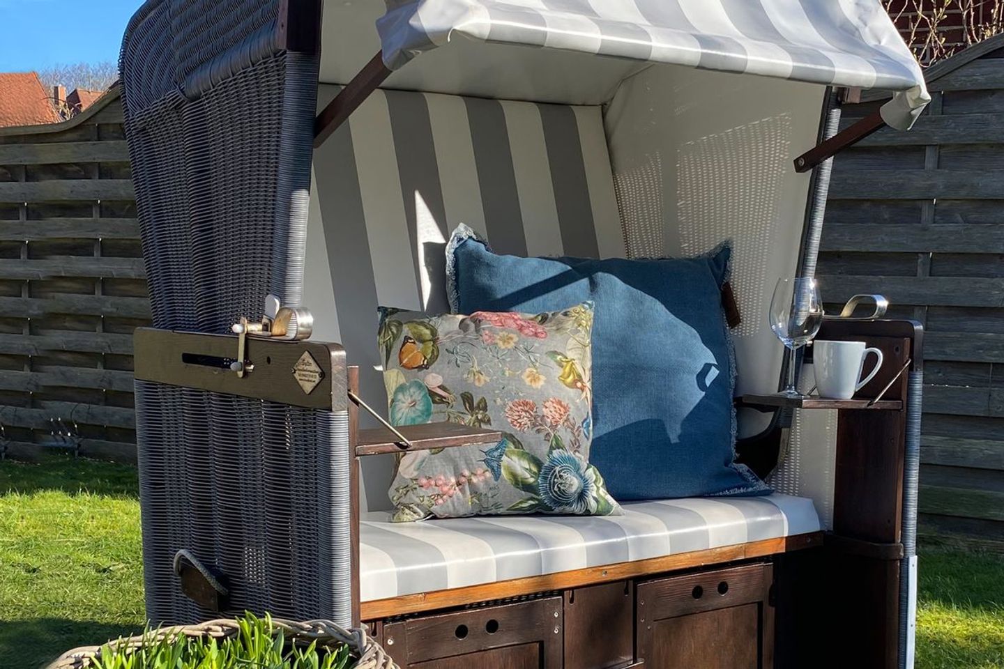 Gartenterrasse (Süden) mit Gartenmöbeln und Strandkorb