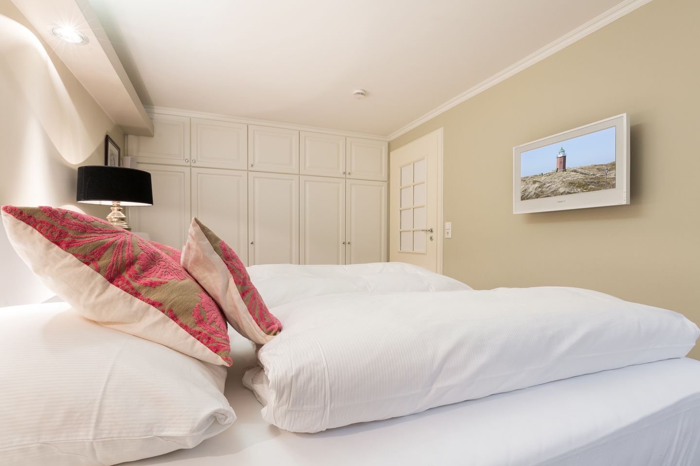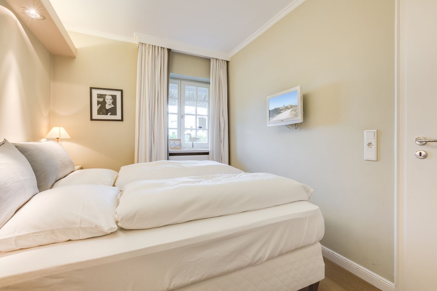 Erdgeschoss: Entree mit Spiegel und kleiner Geraderobe. Hochwertig und sehr geschmackvoll eingerichteter Wohnraum mit herrlichem Blick in die Dünen- und Heidelandschaft, kleinem Wintermeerblick sowie Flat-TV, DVD, Yamaha-Bose-Hifianlage und Telefon. Schöne Sitzecke. Integrierte Landhausküche mit Geschirrspüler und Backofen. Sehr schöne, große (40m²), heckenrosengesäumte und zum Meer gelegene Westterrasse mit phantastischem Südblick über die Dünen, Teakmöbeln und Standkorb (ca. von April–Oktober). Ein romantischer, nach Osten ausgerichteter Raum mit Luxusdoppelbett (fennobed continental), großzügigem Tischlereinbauschank sowie Flat-DVD-TV und Bose Sounddock.