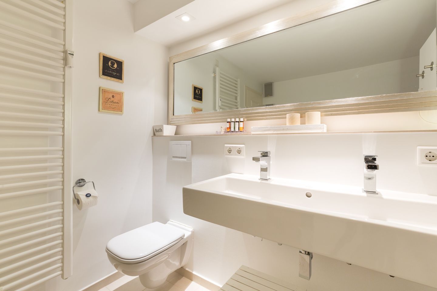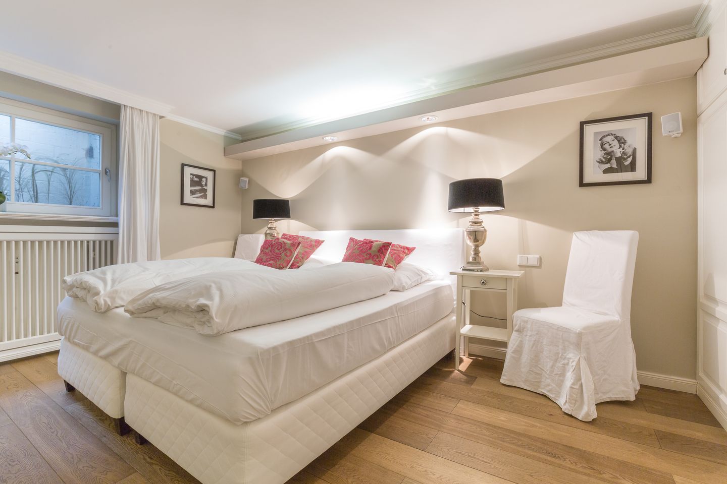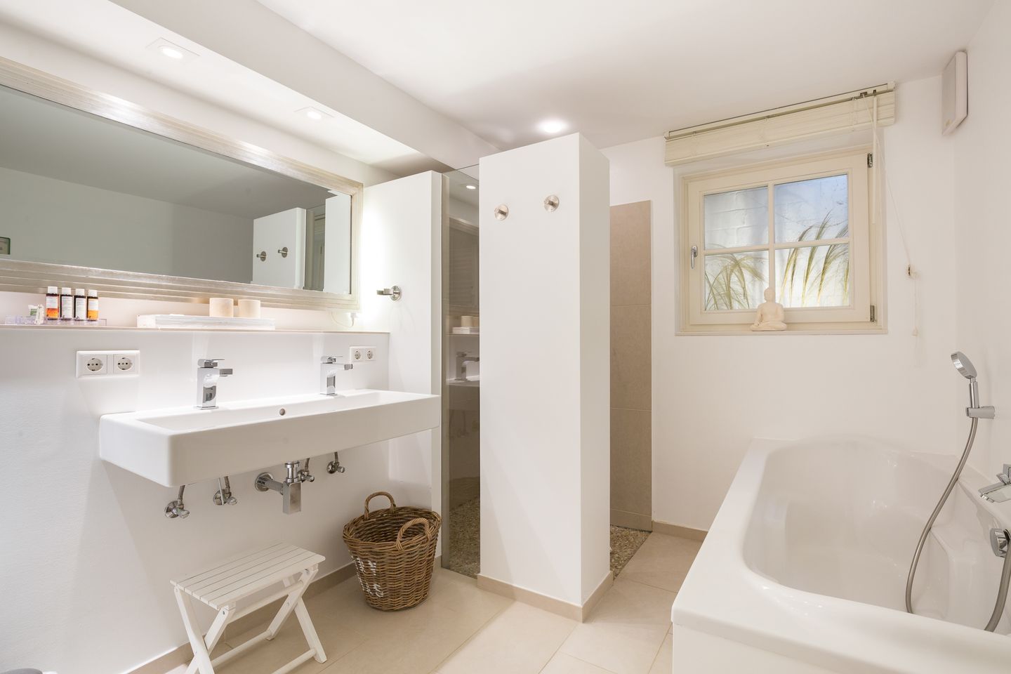 Untergeschoss: 2 großzügige Wohlfühlbäder mit Fußbodenheizung, integrierten Haartrocknern und begehbaren Duschen, davon eines mit Dusche/WC, das zweite mit Wanne, Dusche, WC und Stereo-Soundsystem. Ein großzügiger, sehr schön gestalteter Raum mit Luxusdoppelbett (fennobed continental), Flat-TV, Teac-Canton-Hifianlage und viel Schrankplatz (hochwertige Tischlereinbauten). Kleiner Hauswirtschaftsraum mit kombiniertem Waschmaschinen-Trocknerautomat und etwas Stauraum.