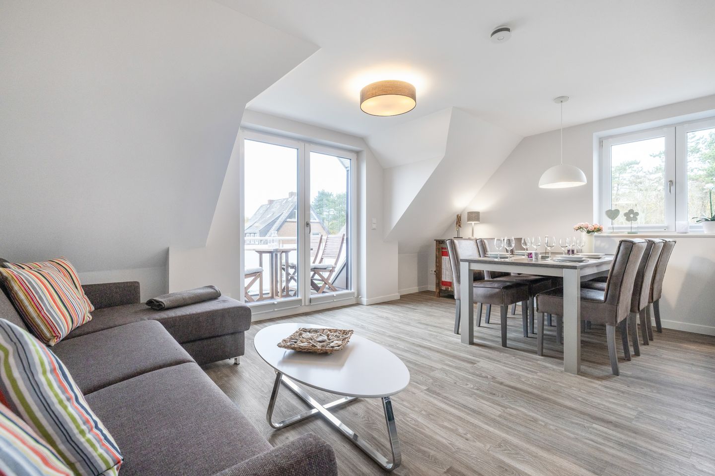 Im Wohnraum des Appartements finden Sie eine gemütliche Sofaecke und einen Essbereich. Von hier aus erreichen Sie außerdem Ihren möblierten Balkon, auf dem Sie die Nordseeluft genießen können. Die Küchenzeile verfügt über einen Induktionsherd und Backofen sowie eine Geschirrspülmaschine, sodass Sie sich hier problemlos ein leckeres Urlaubsessen zubereiten können. Auf gleicher Ebene des Appartements finden Sie ein Schlafzimmer mit Doppelbett und Flatscreen-TV sowie ein Tageslichtbad mit Dusche und Waschmaschine.