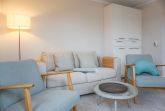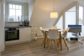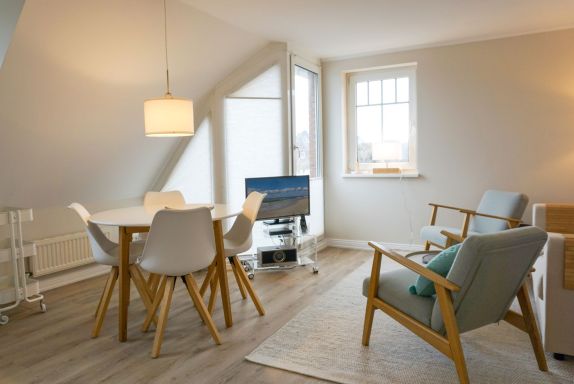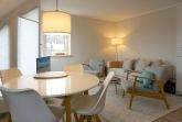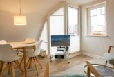 OG: Wohnzimmer mit Flatscreen-TV, Blu-Ray-, DVD- & CD-Player; Essbereich, offene Küche mit Backofen, Induktionsherd, Spülmaschine, Kaffee- und Nespresso-Maschine; Schlafzimmer mit Doppelbett; Duschbad, Balkon.